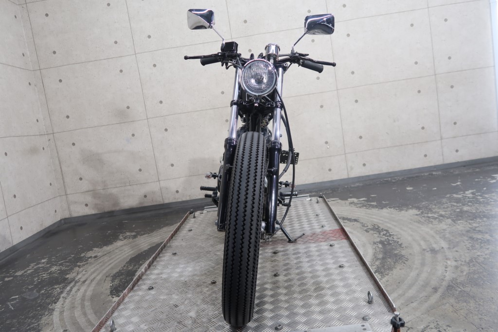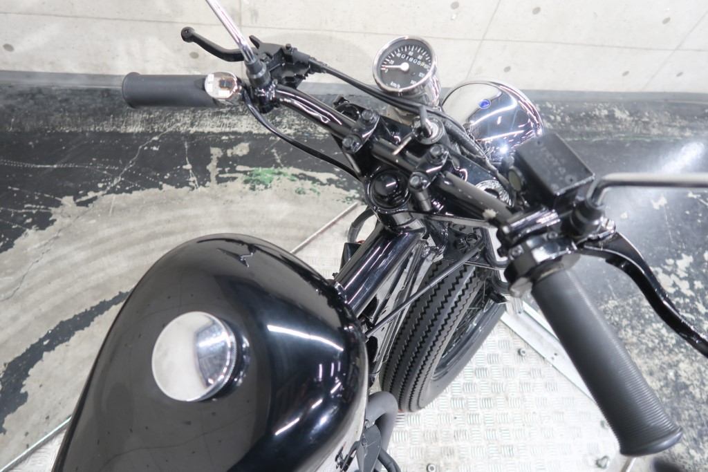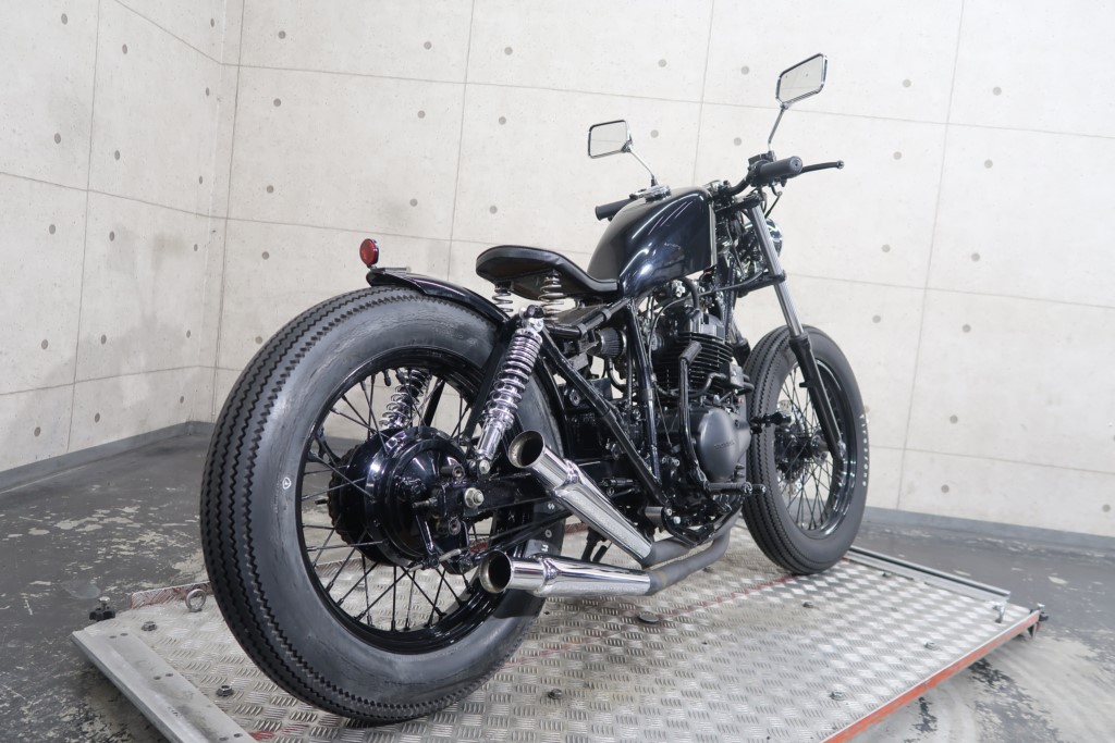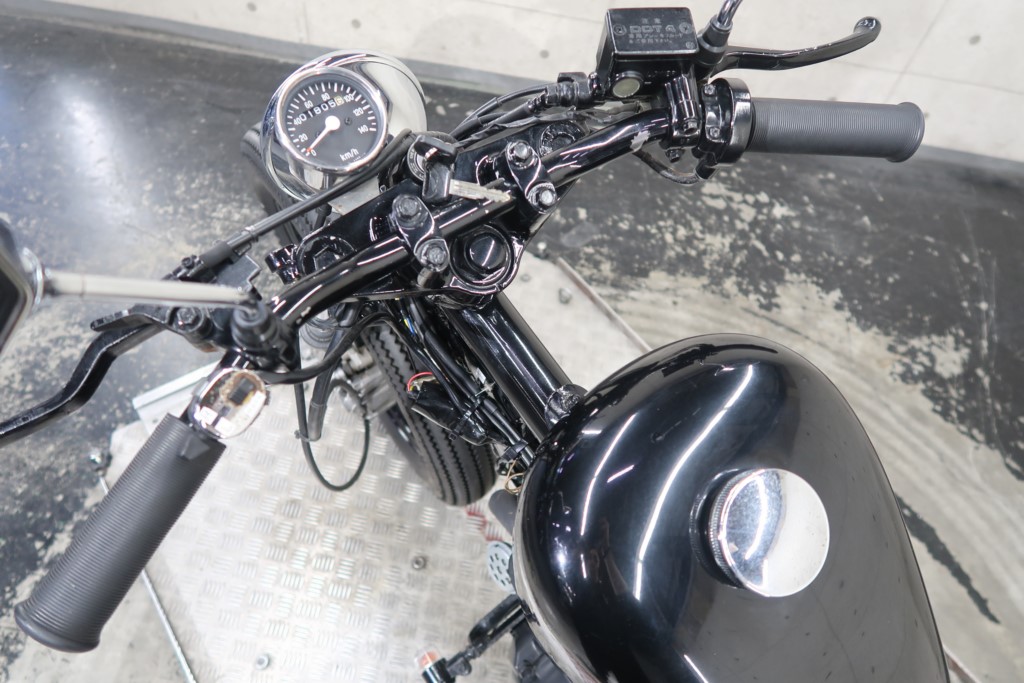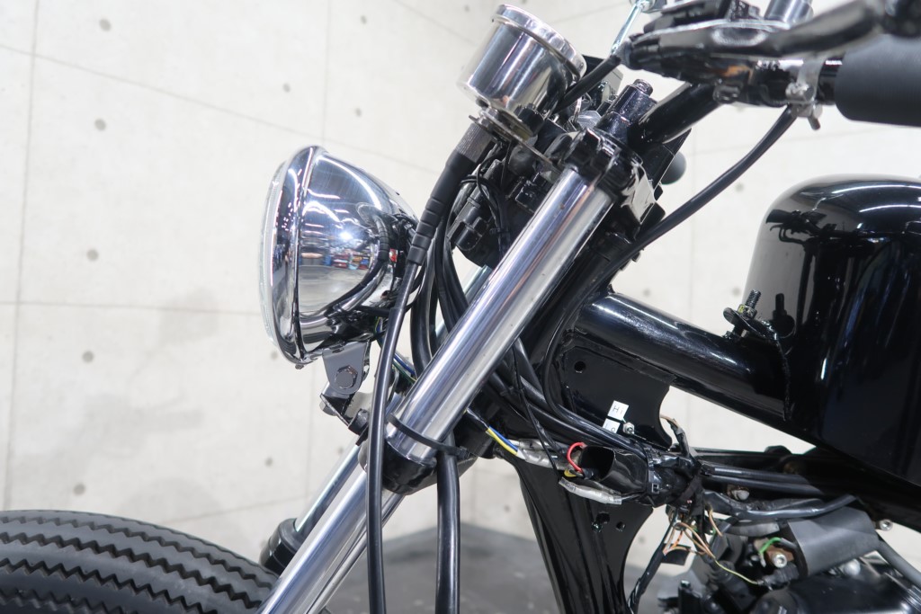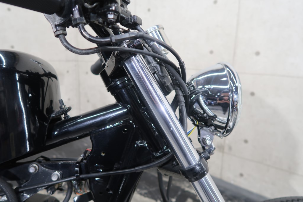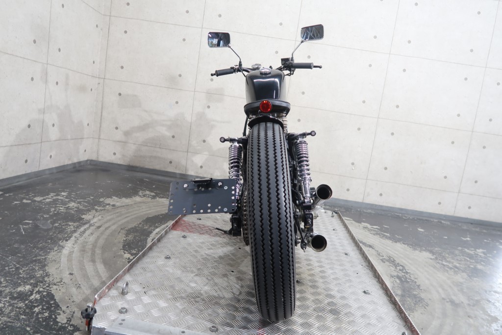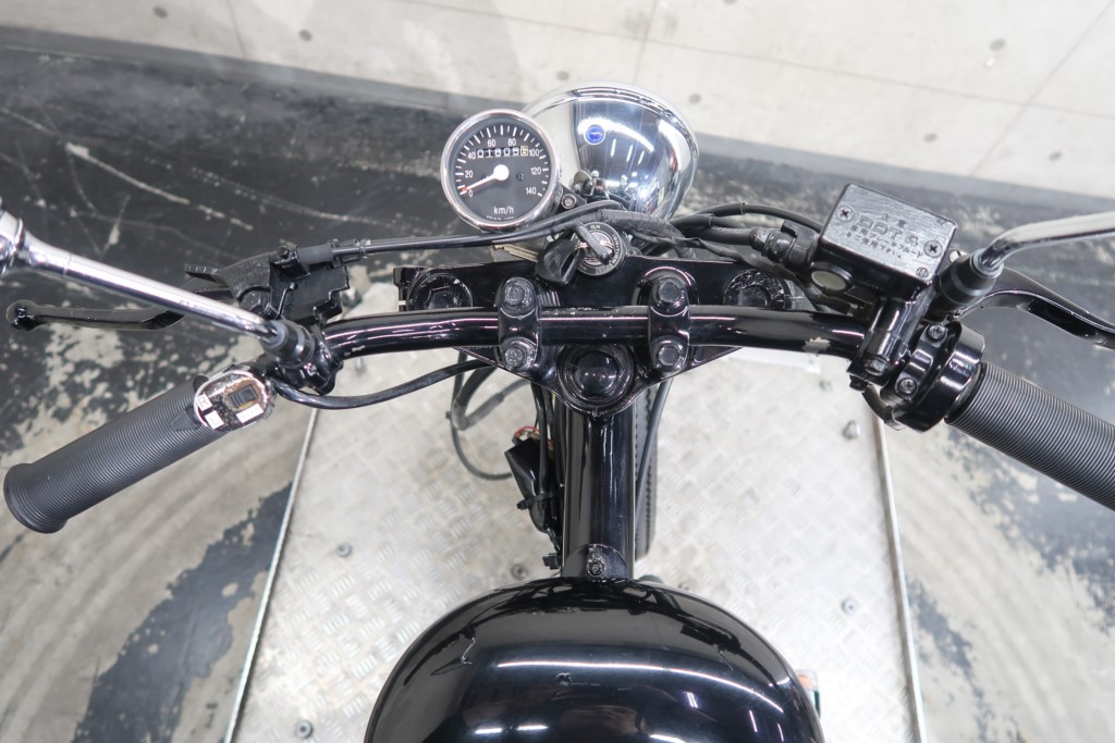 ブラックオールペン、小型スピードメーター、ピーナッツタンク、トランペットマフラー、小型ヘッドライト、サドルシート、テールランプ付きウインカー、サイドプレートステー、バーハンドル、小型スイッチ