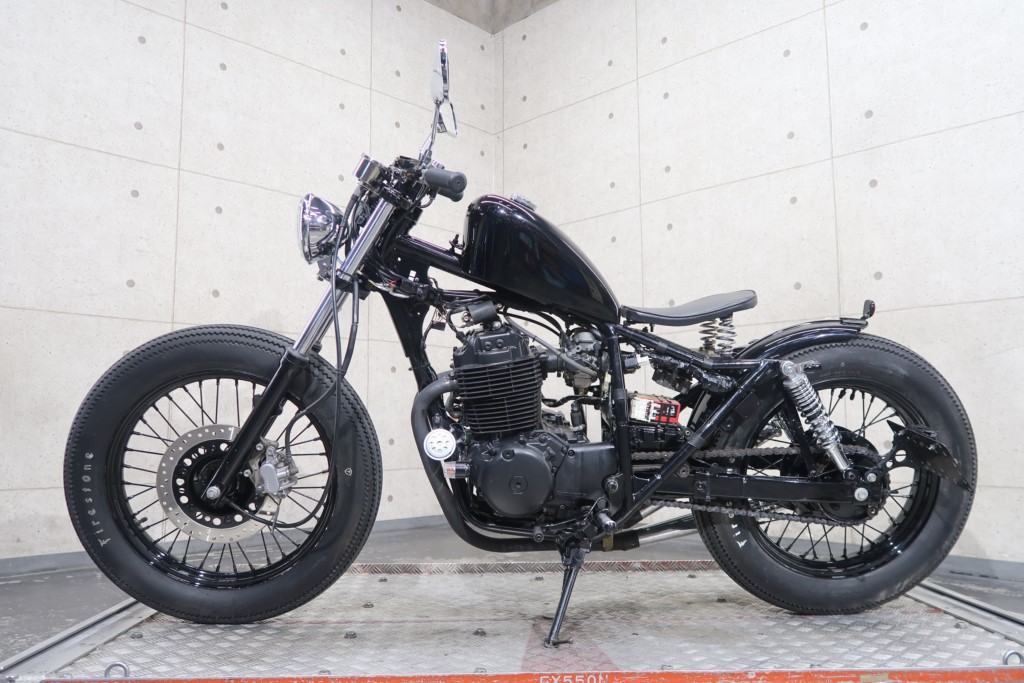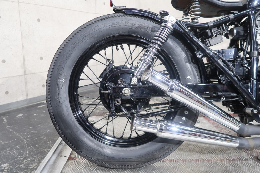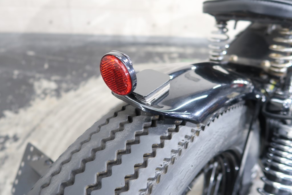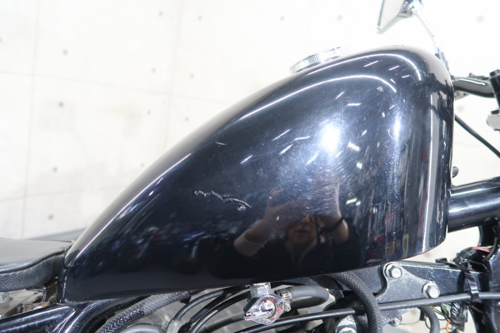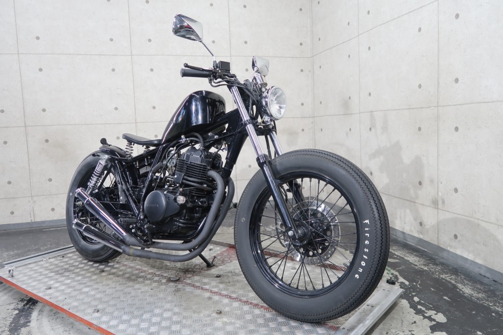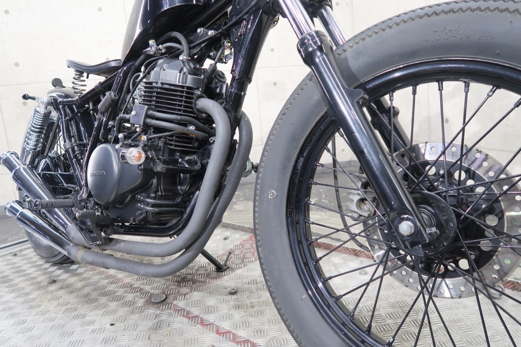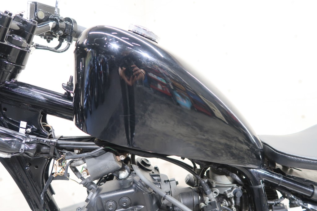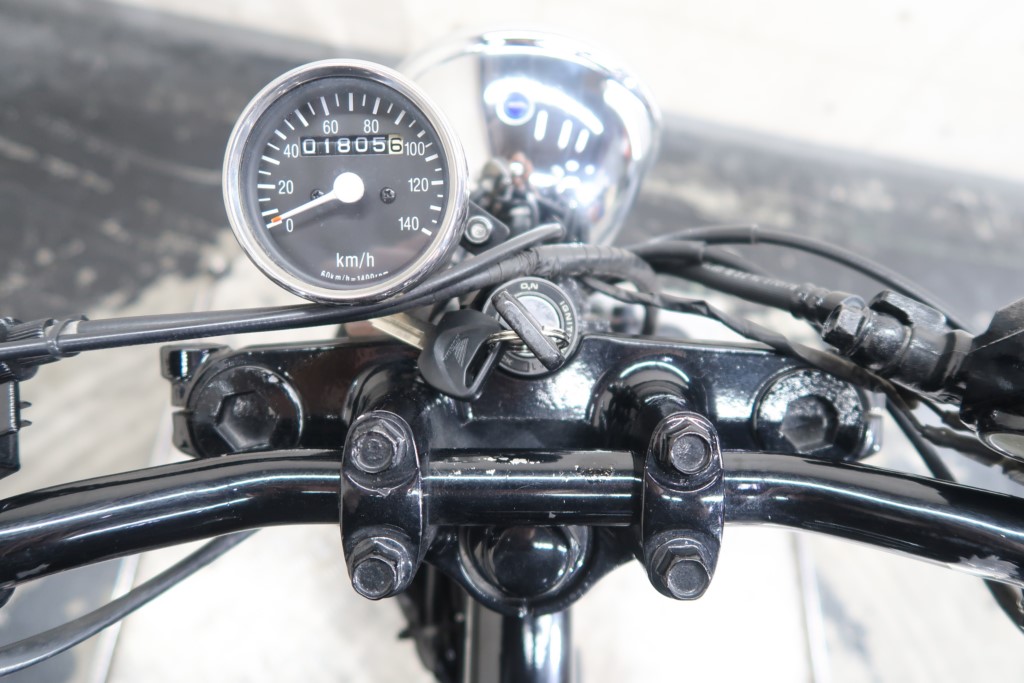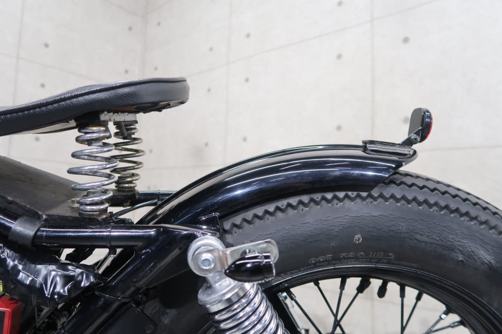 ブラックオールペン、小型スピードメーター、ピーナッツタンク、トランペットマフラー、小型ヘッドライト、サドルシート、テールランプ付きウインカー、サイドプレートステー、バーハンドル、小型スイッチ