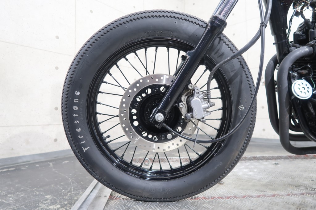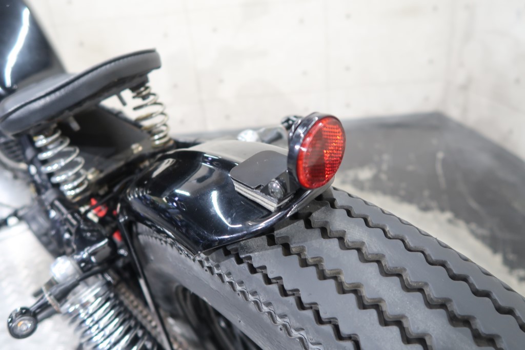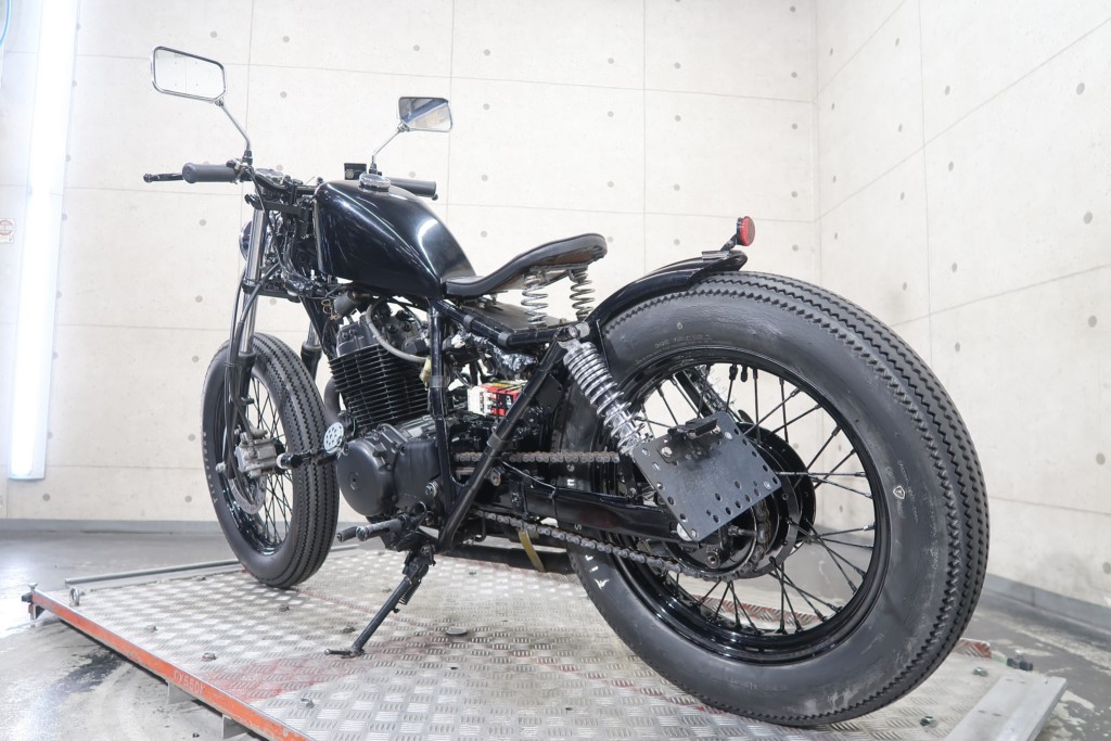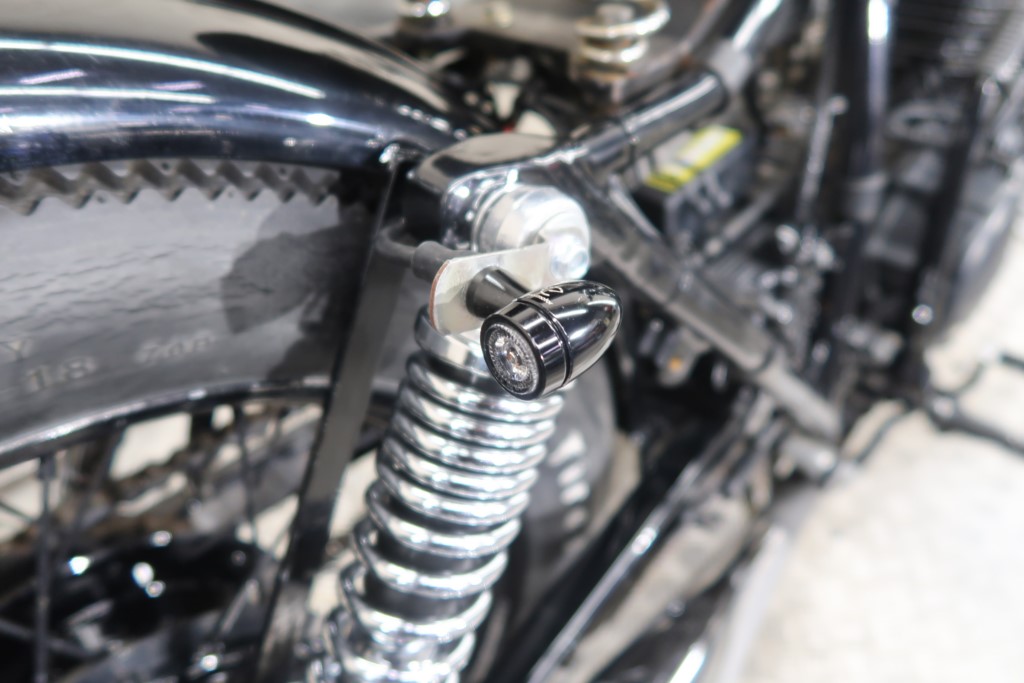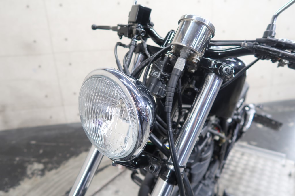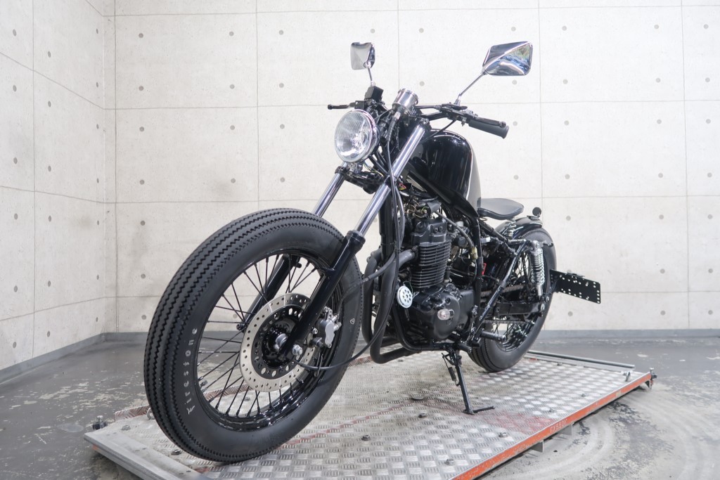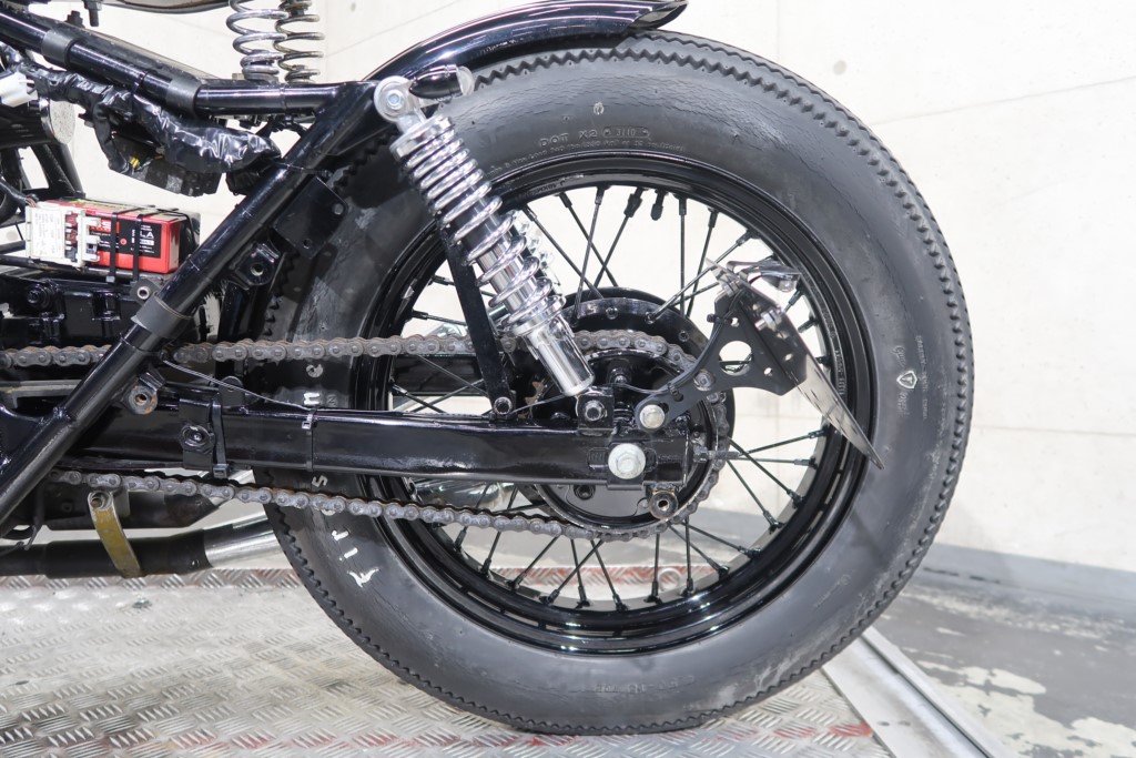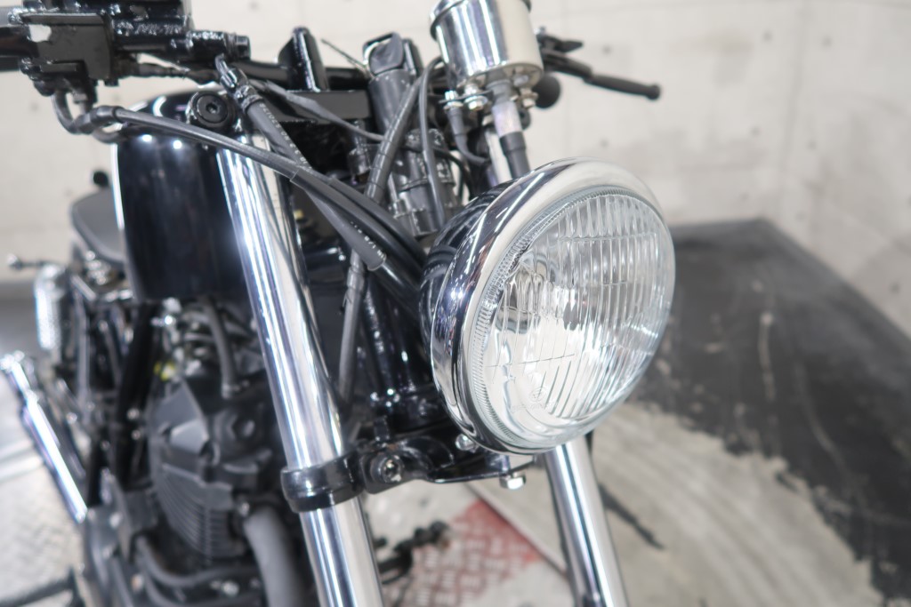 ブラックオールペン、小型スピードメーター、ピーナッツタンク、トランペットマフラー、小型ヘッドライト、サドルシート、テールランプ付きウインカー、サイドプレートステー、バーハンドル、小型スイッチ