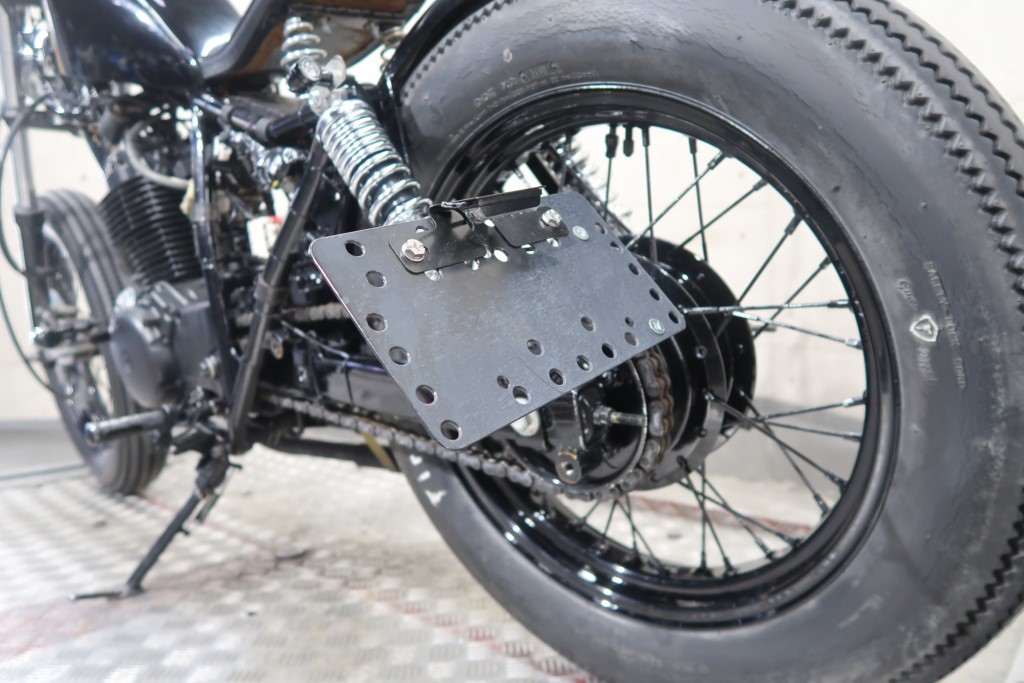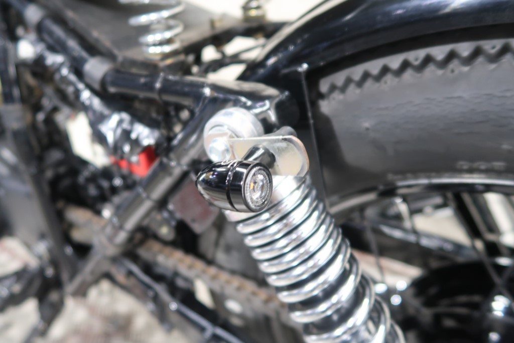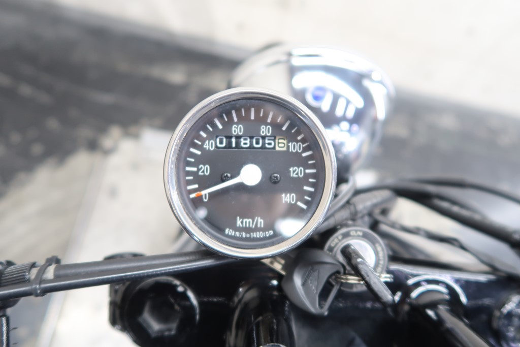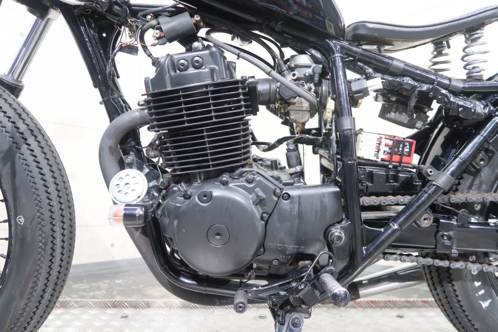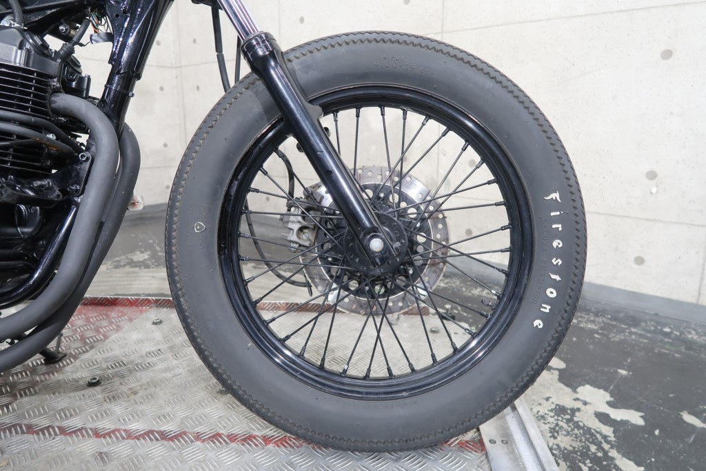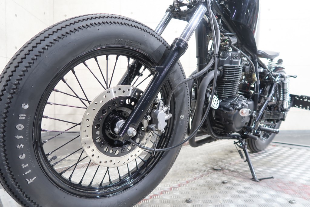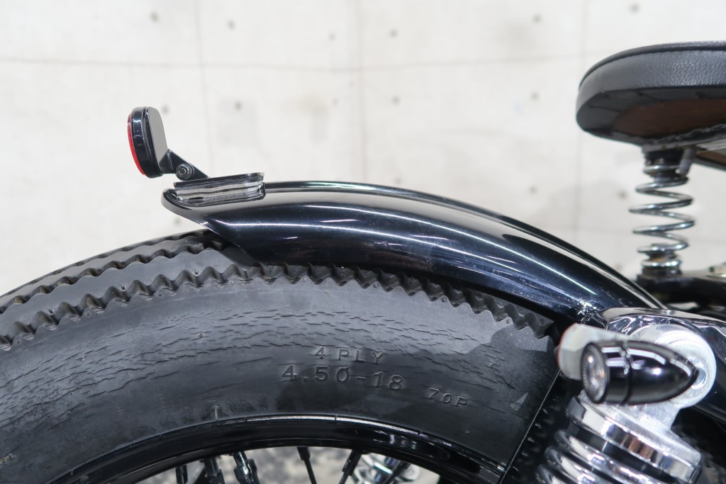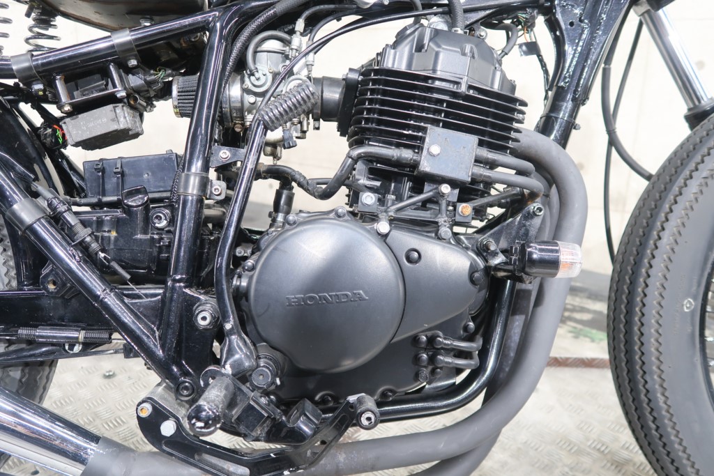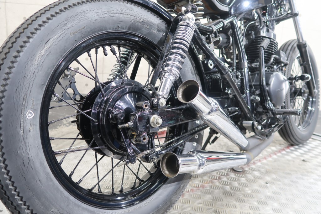 ブラックオールペン、小型スピードメーター、ピーナッツタンク、トランペットマフラー、小型ヘッドライト、サドルシート、テールランプ付きウインカー、サイドプレートステー、バーハンドル、小型スイッチ