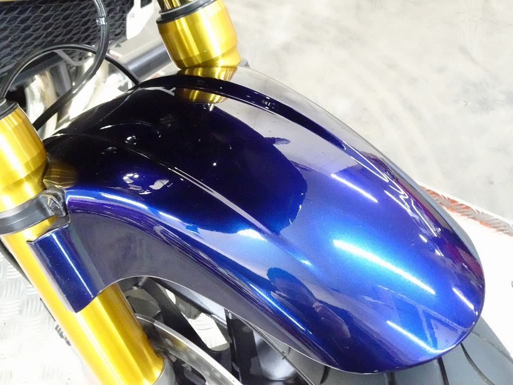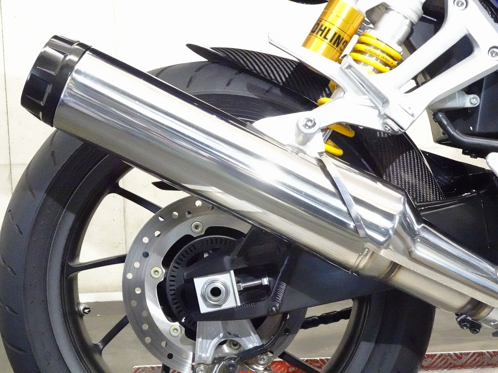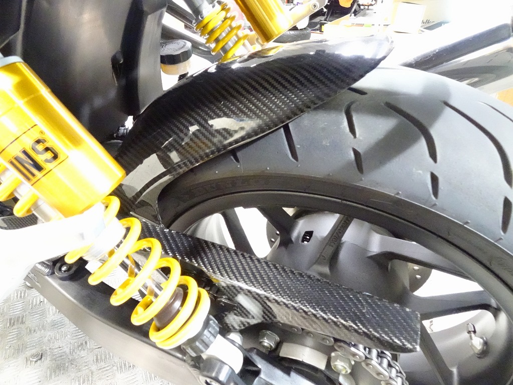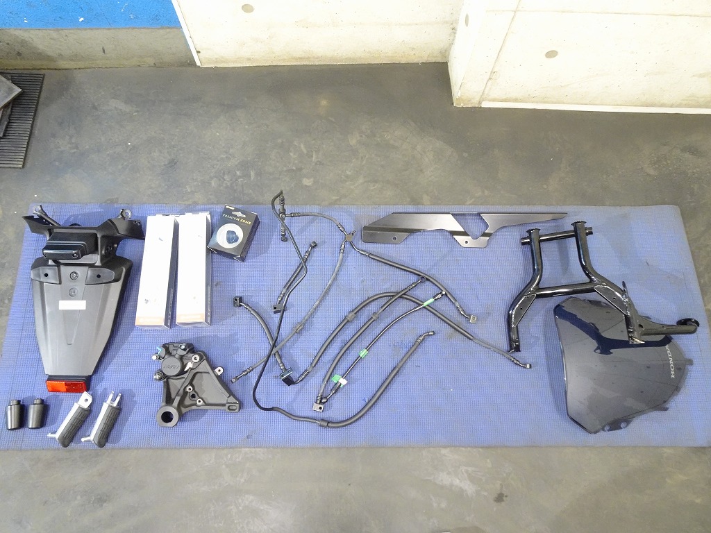 標準装備(グリップヒーター、ETC2.0車載器)、ゼログラビティ製スクリーン、カーボン調(インナーフェンダー、チェーンカバー)、グリップエンド、ハンドルブレース、エンジンスライダー、アクティブ製フェンダーレス、ステップ、ブレーキレバー&クラッチレバー、タンクパッド、オイルキャップ、前後ブレーキワイヤーメッシュホース等