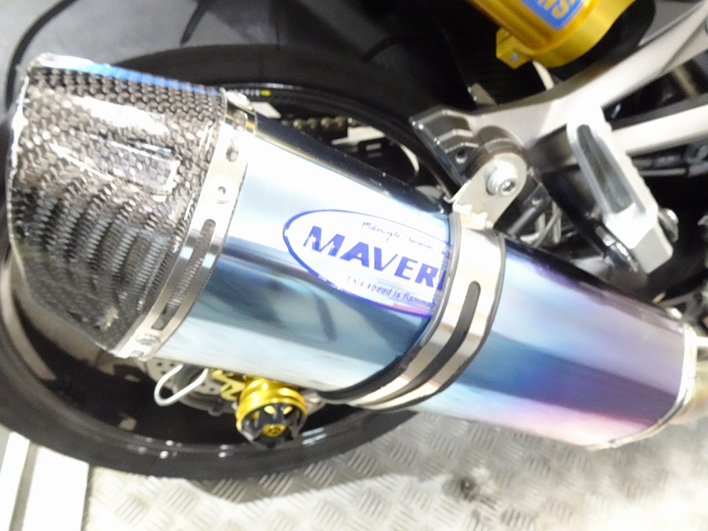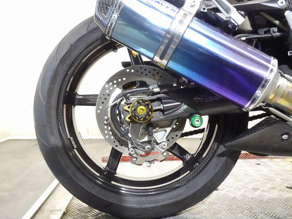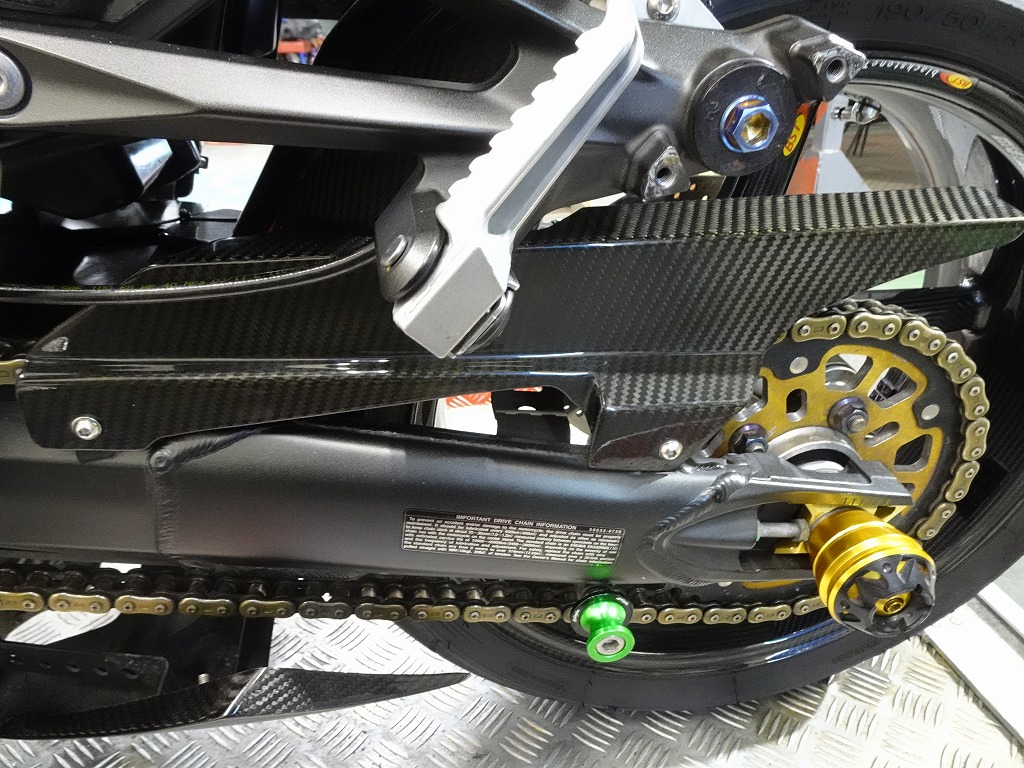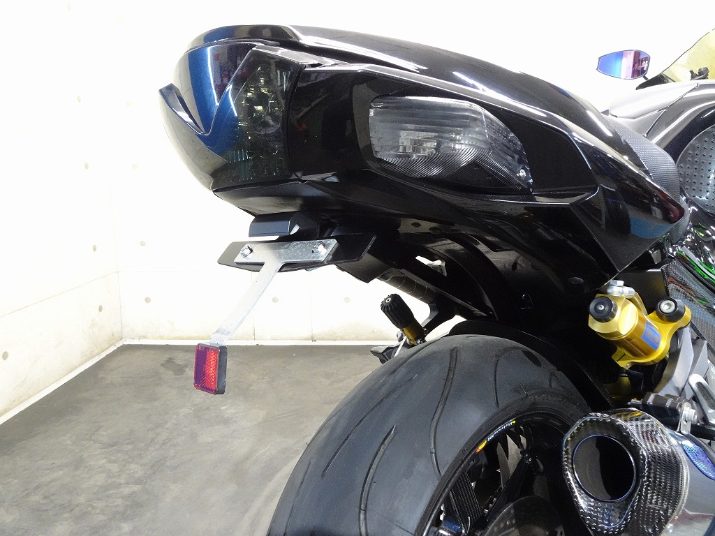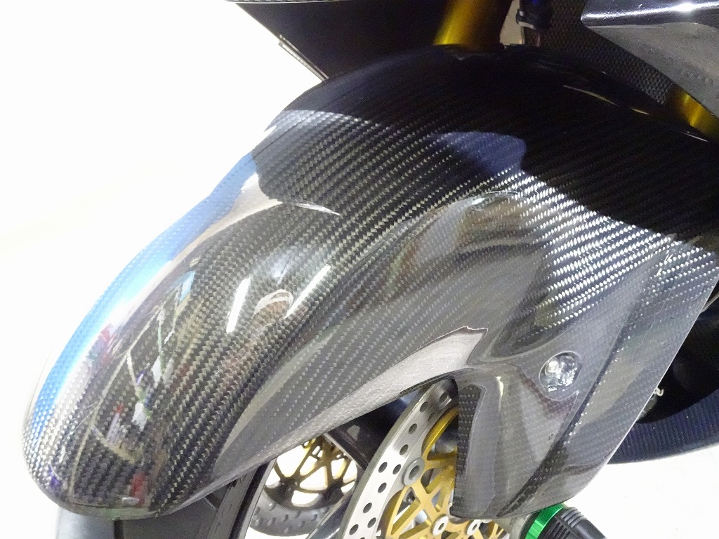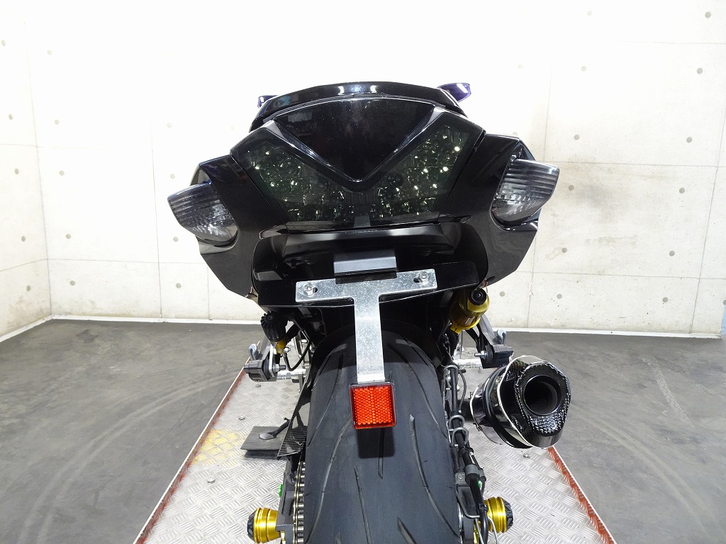 前後オーリンズサス、前後ブレンボキャリパー、フロントブレンボブレーキディスク、リアサンスターブレーキディスク、マーベリックチタンサイレンサー、R’sギアソニックエキパイ、バックステップ、カーボンパーツ(フロントフェンダー、フレームカバー、アンダーカウル、アンダースポイラー、リアインナーフェンダー)カーボン風アッパーカウル、インナーカウル、BST前後カーボンホイール、タンクパッド、前後アクスルスライダー、フレームスライダー、スケルトンクラッチカバー、Kファクトリークラッチレリーズシリンダー、リアフェンダーレス、シングルシートカウル、灯火類LED、イカリング、ETC車載器、他