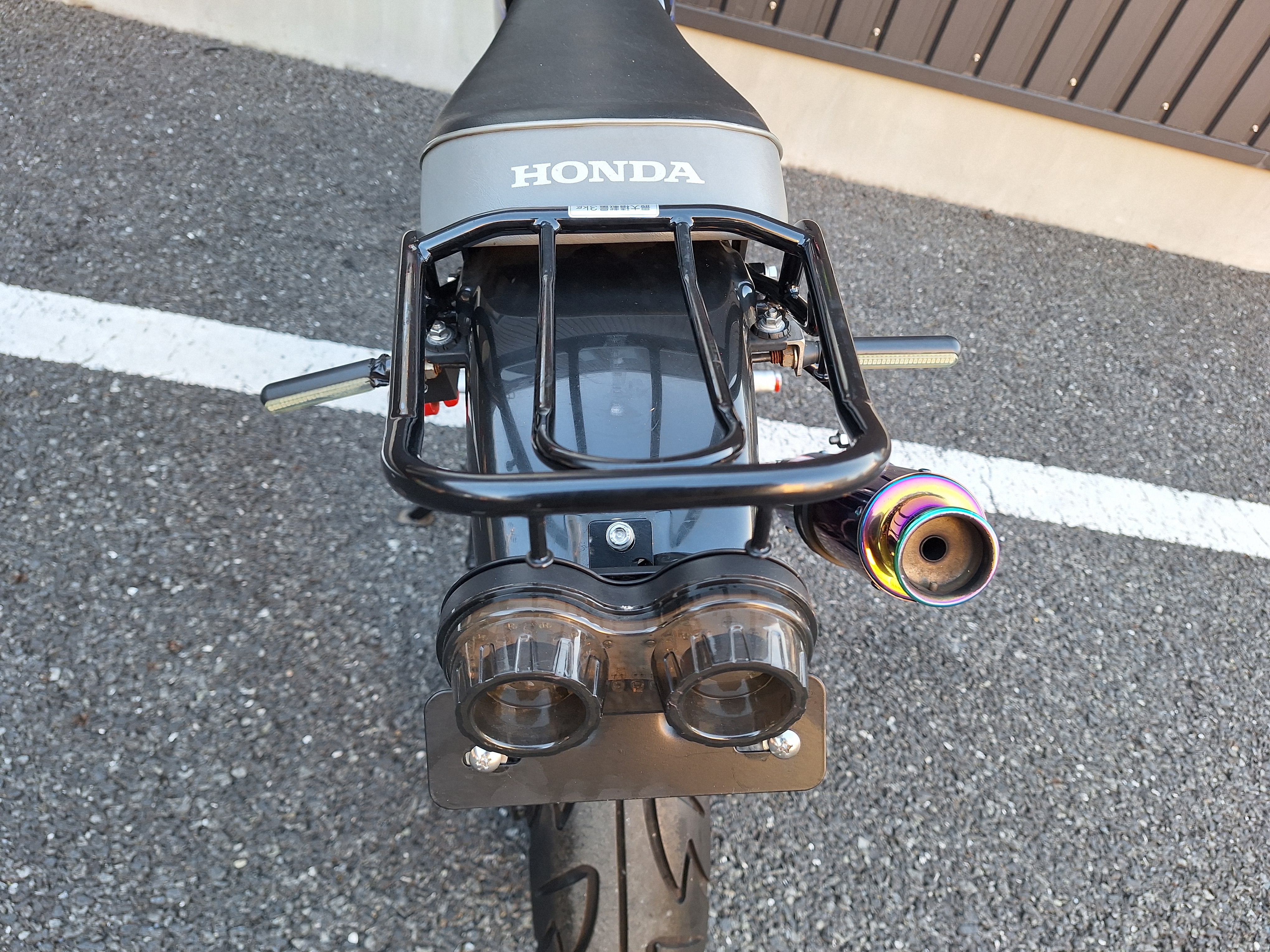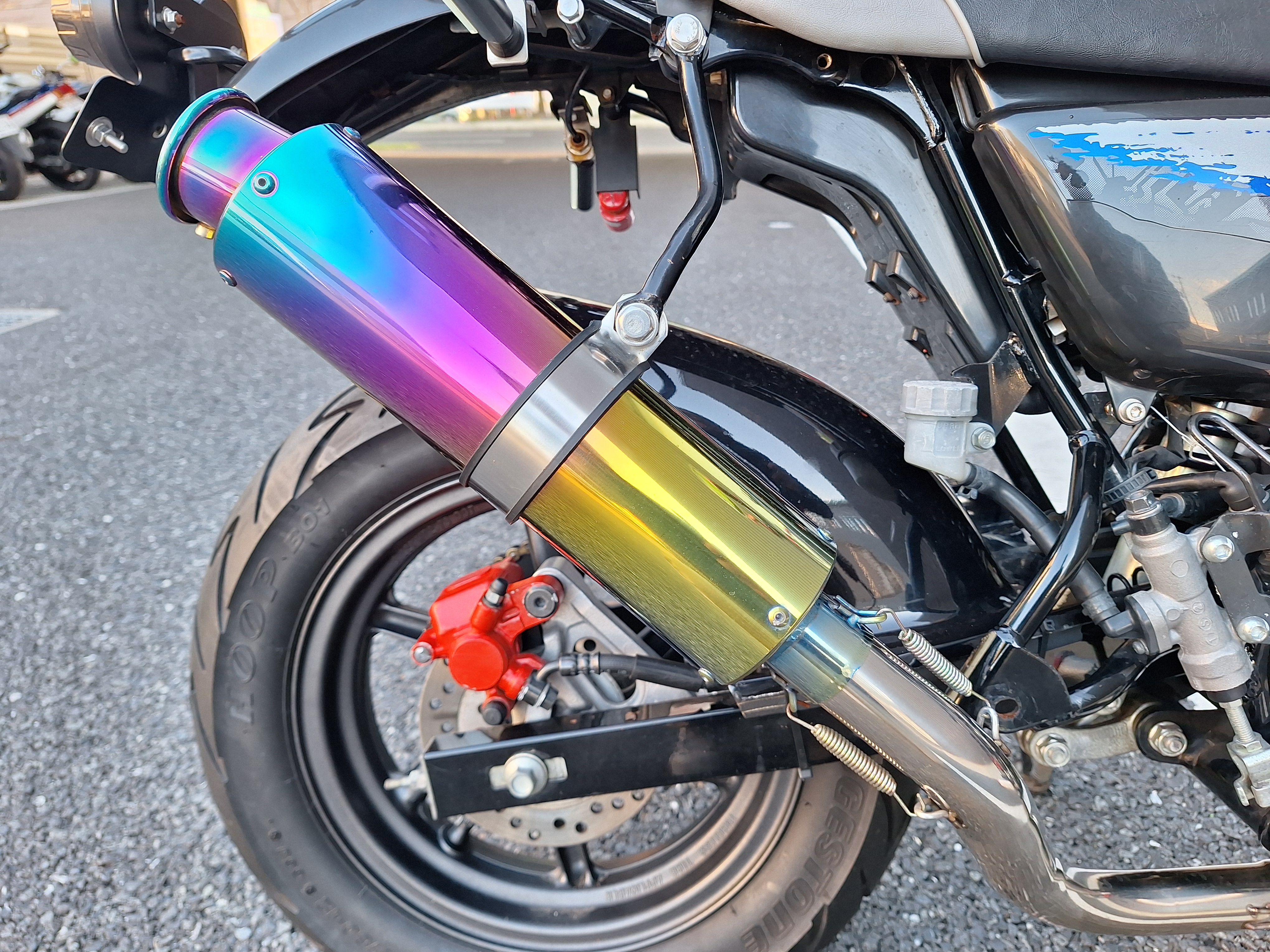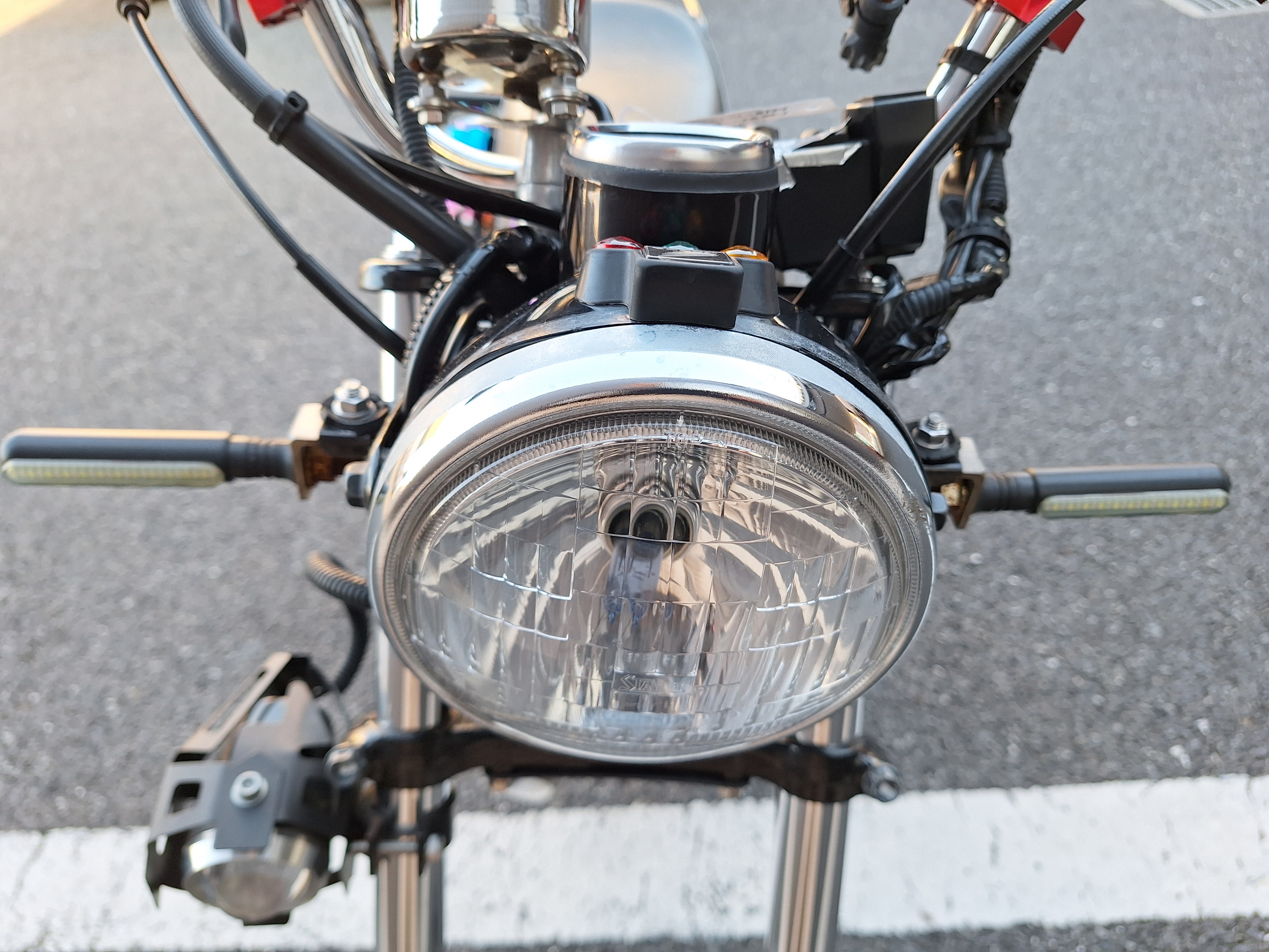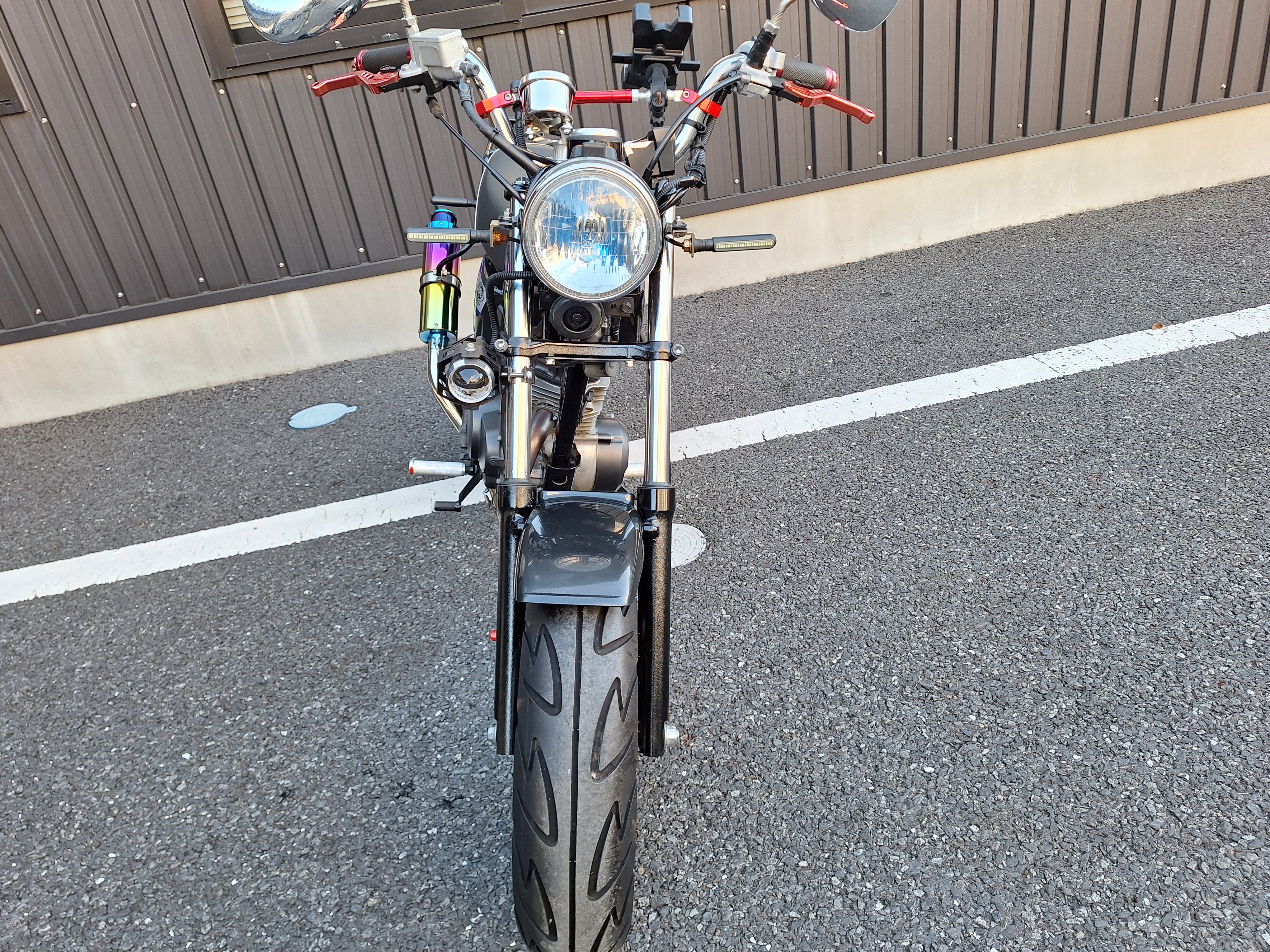 取付パーツ・社外チタンカラーマフラー、LEDウインカーセット、リヤフェンダーレスキット&テールライト、フロントダウンフェンダー、リヤインナーフェンダー、アルミステップバー、リヤキャリア、社外アジャストレバー、フォグランプ付