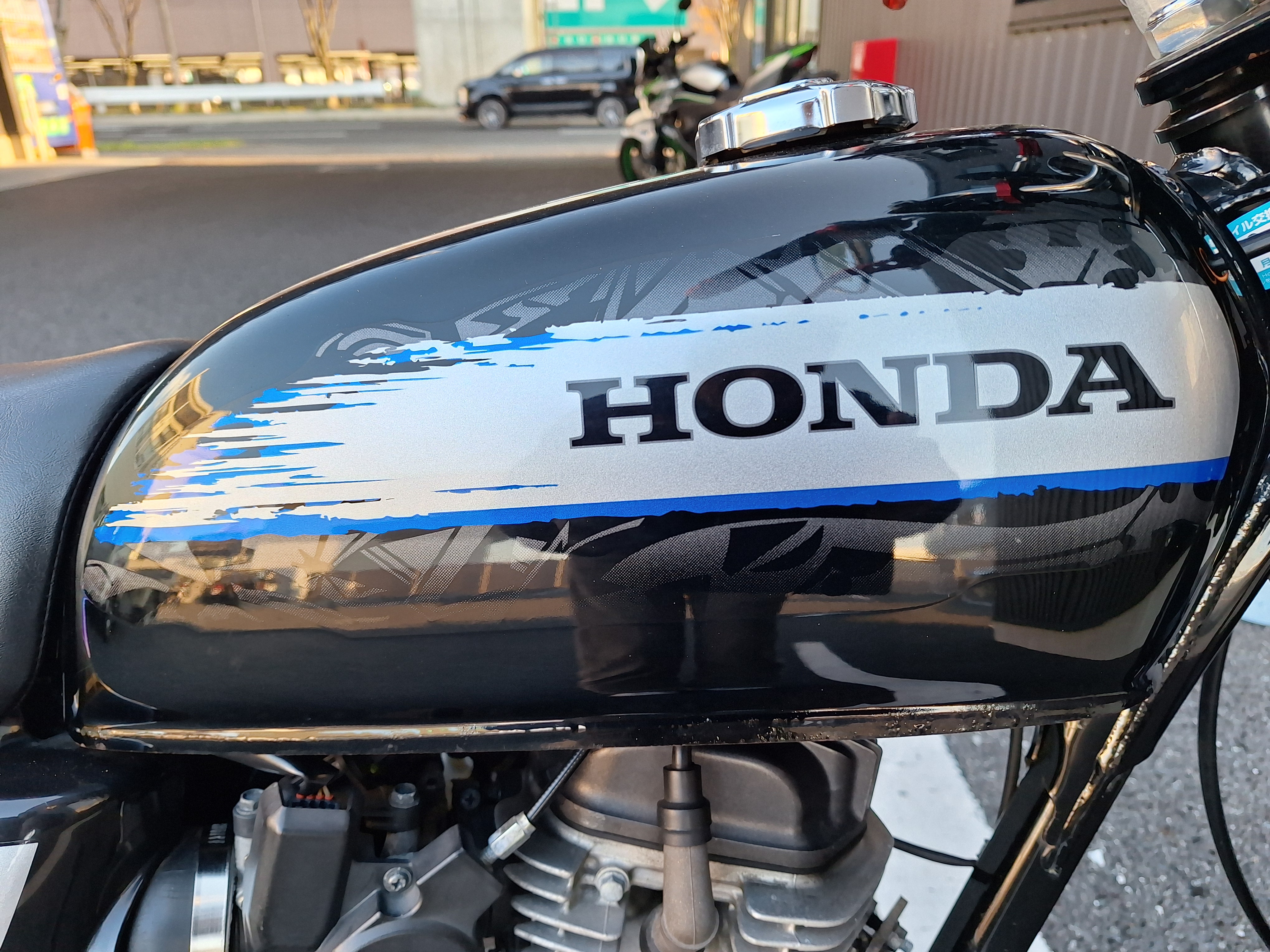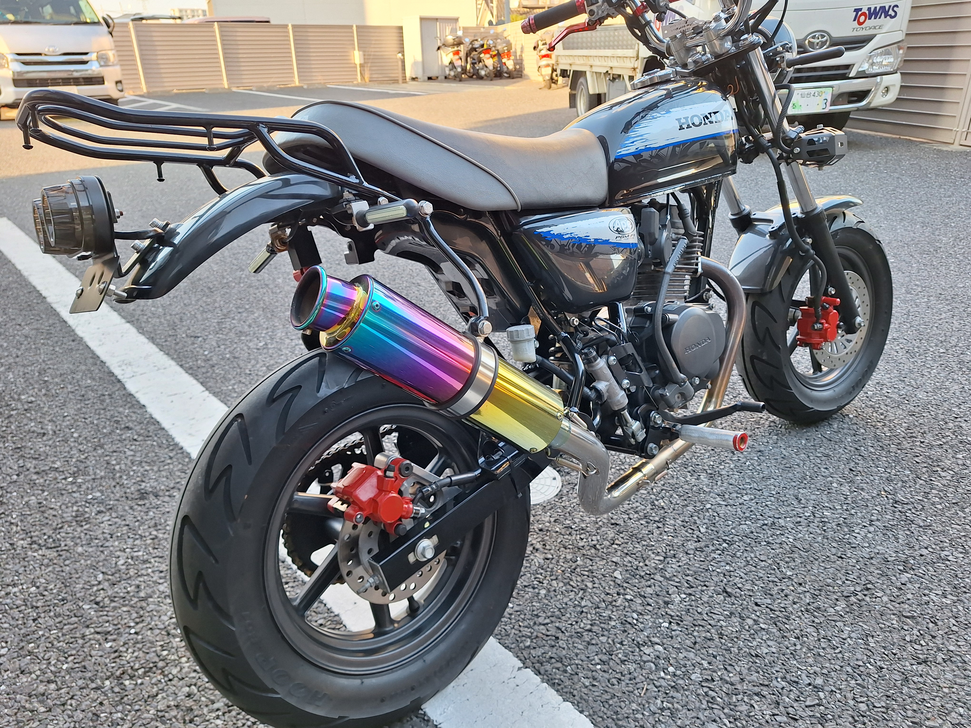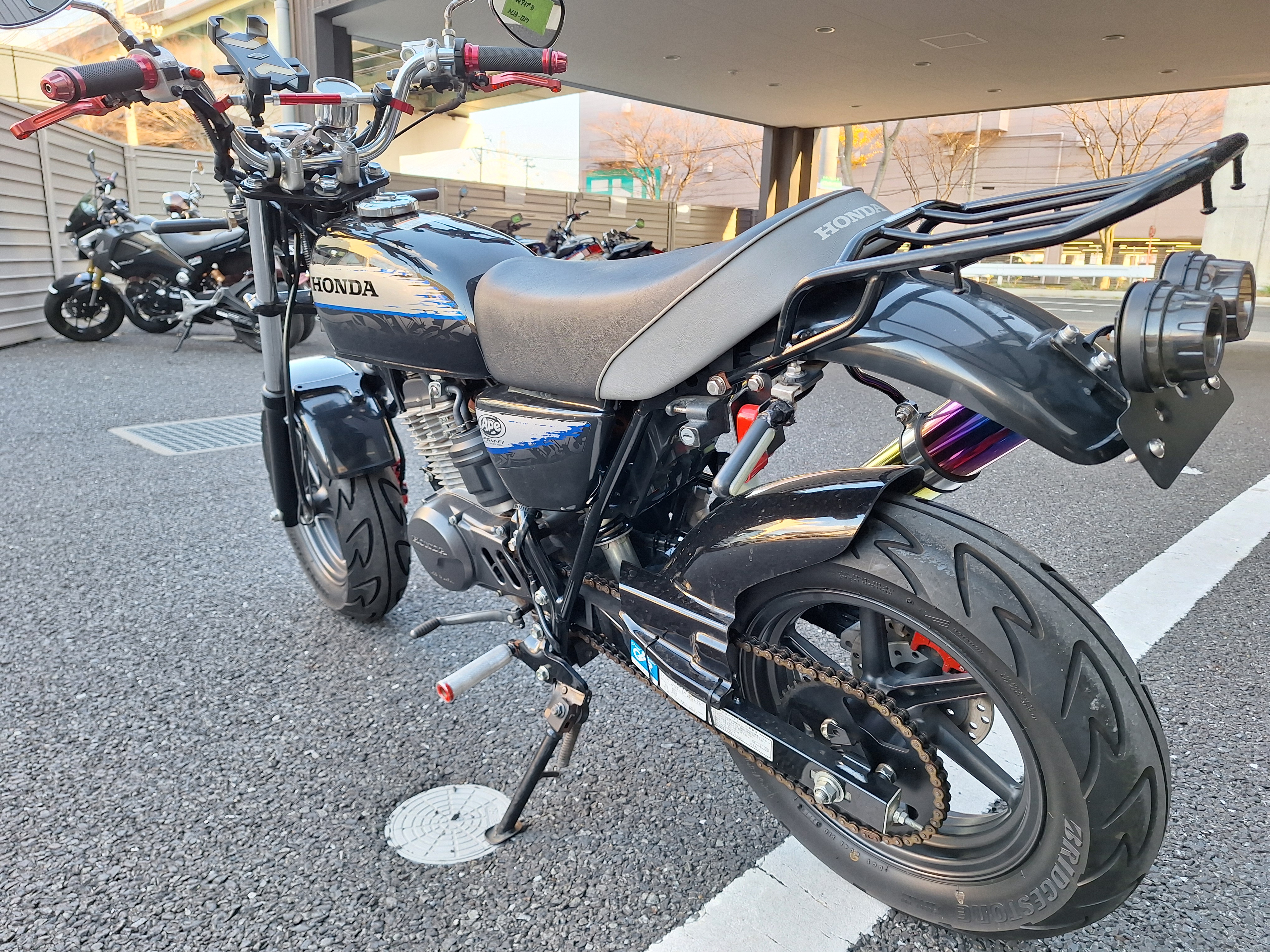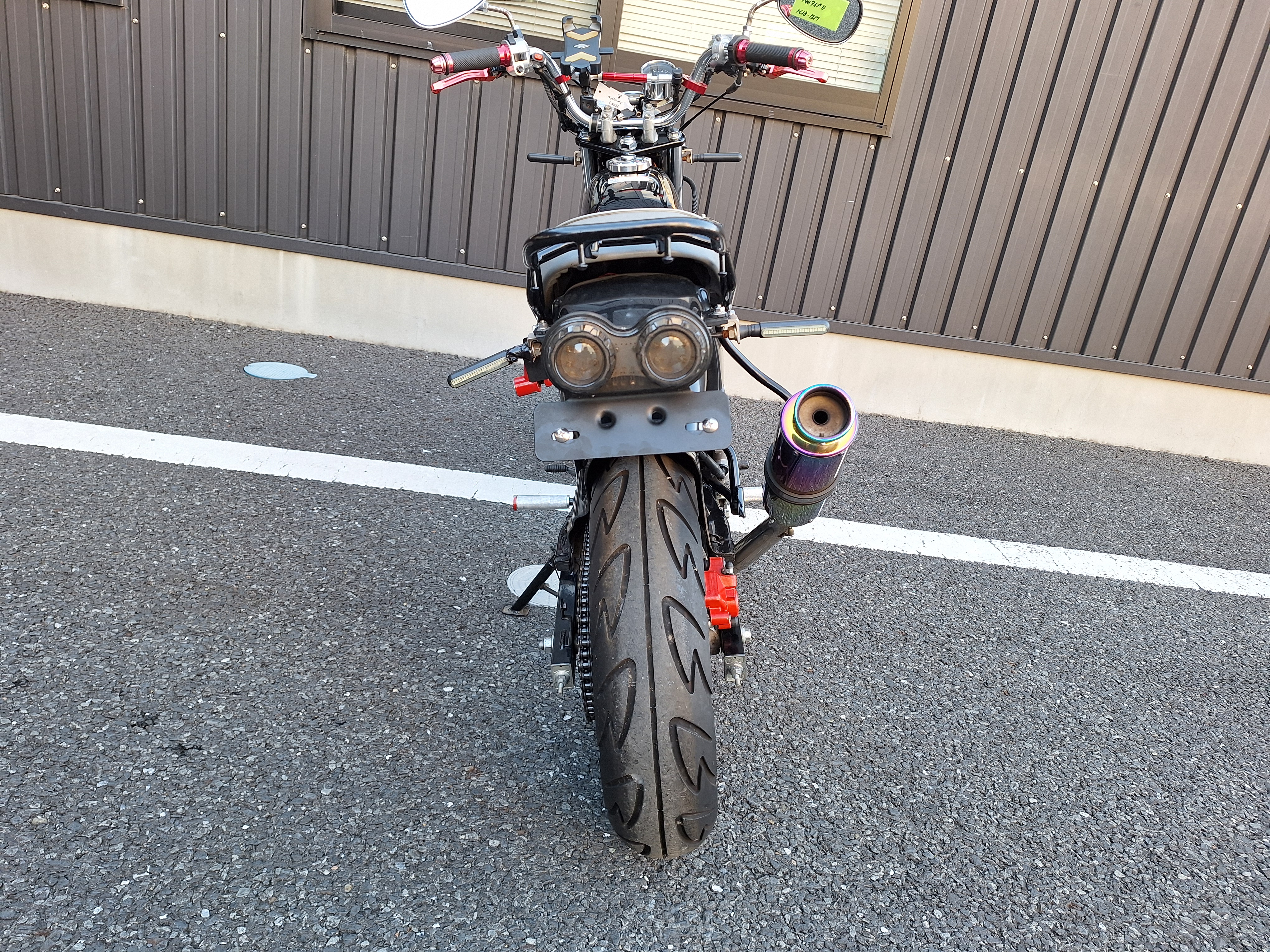 取付パーツ・社外チタンカラーマフラー、LEDウインカーセット、リヤフェンダーレスキット&テールライト、フロントダウンフェンダー、リヤインナーフェンダー、アルミステップバー、リヤキャリア、社外アジャストレバー、フォグランプ付