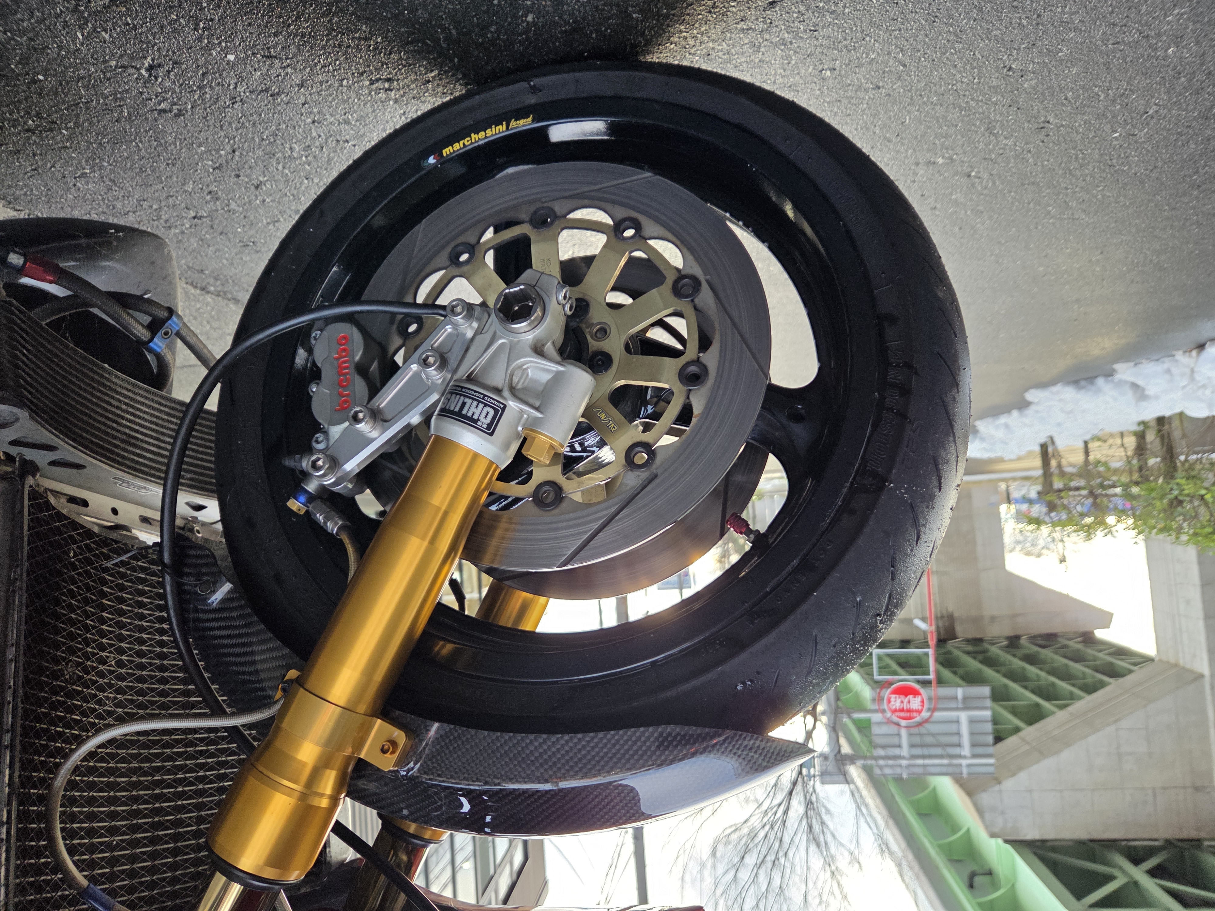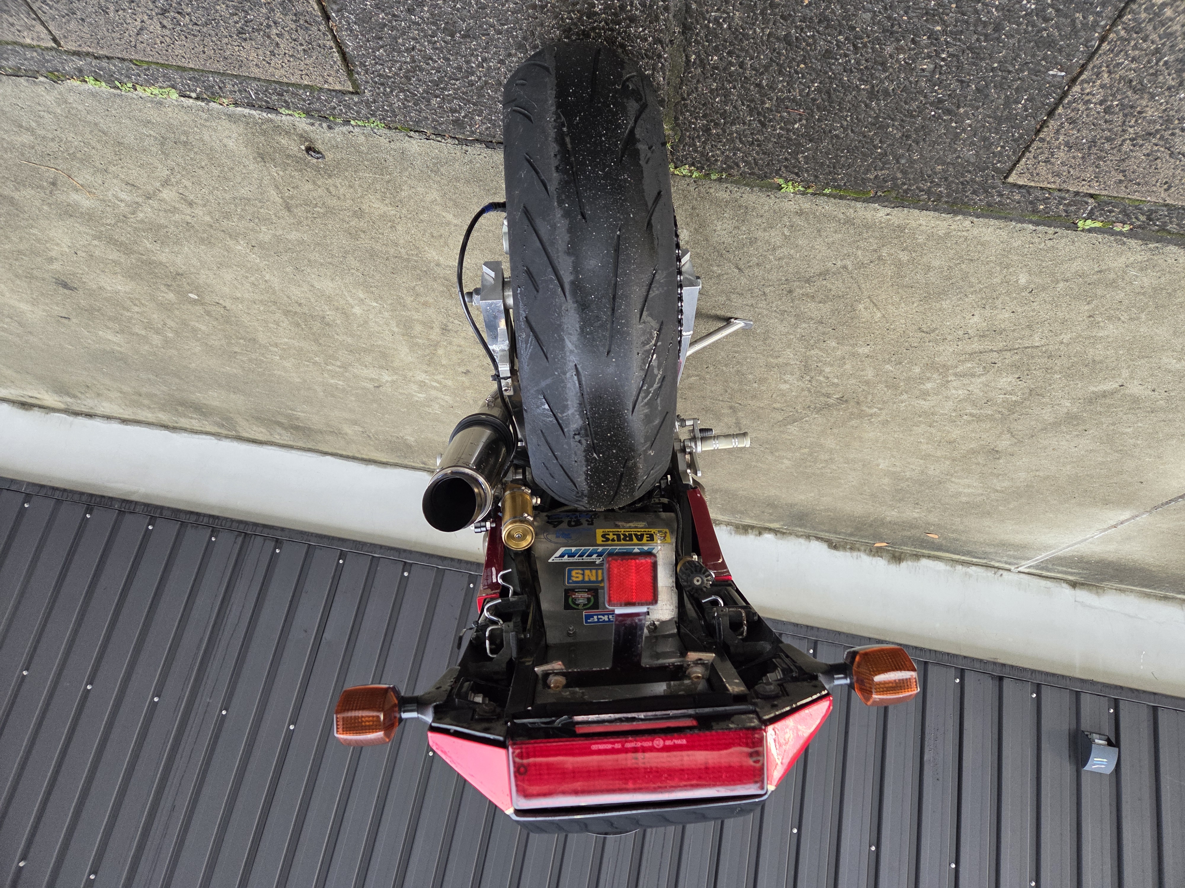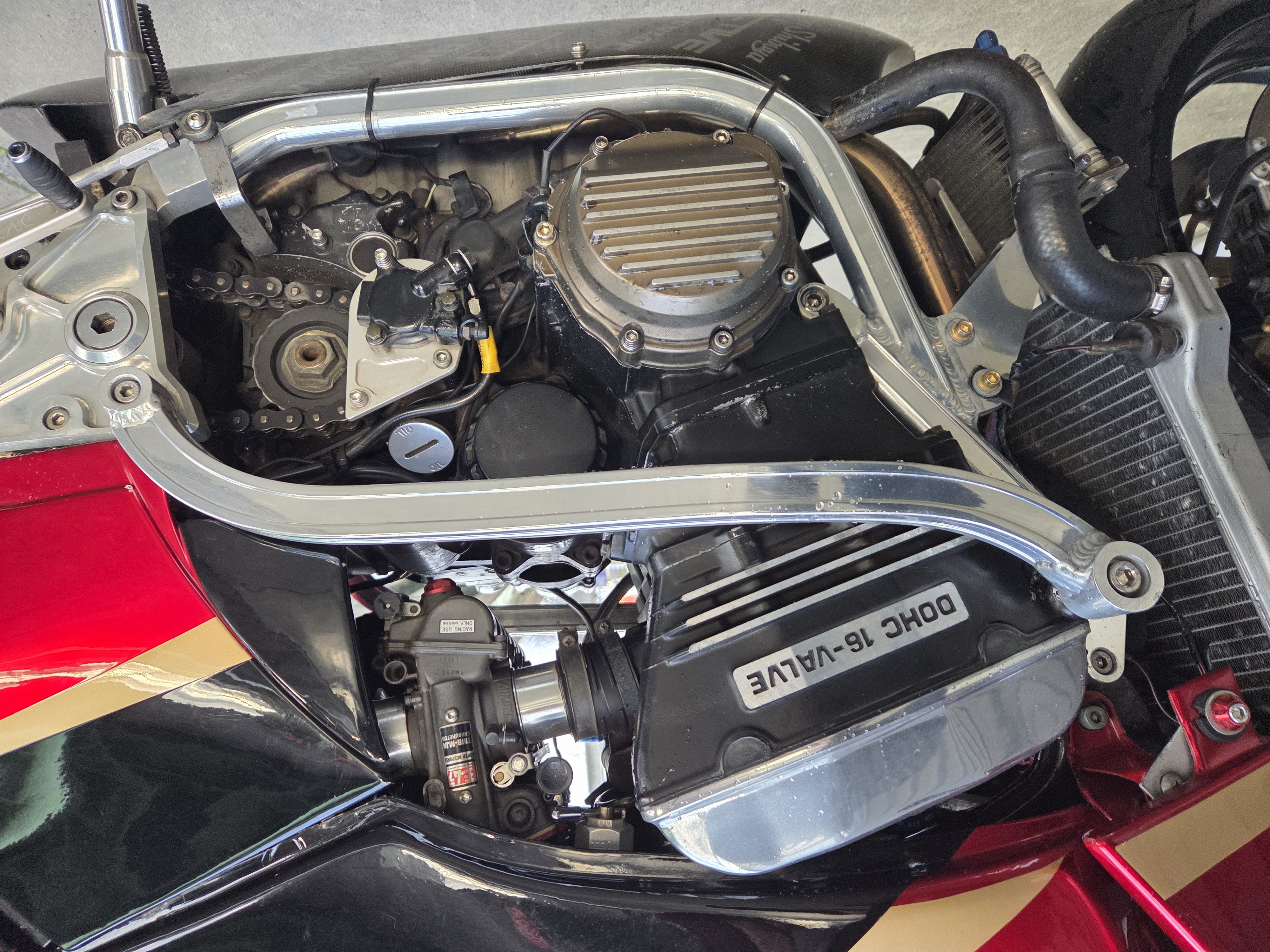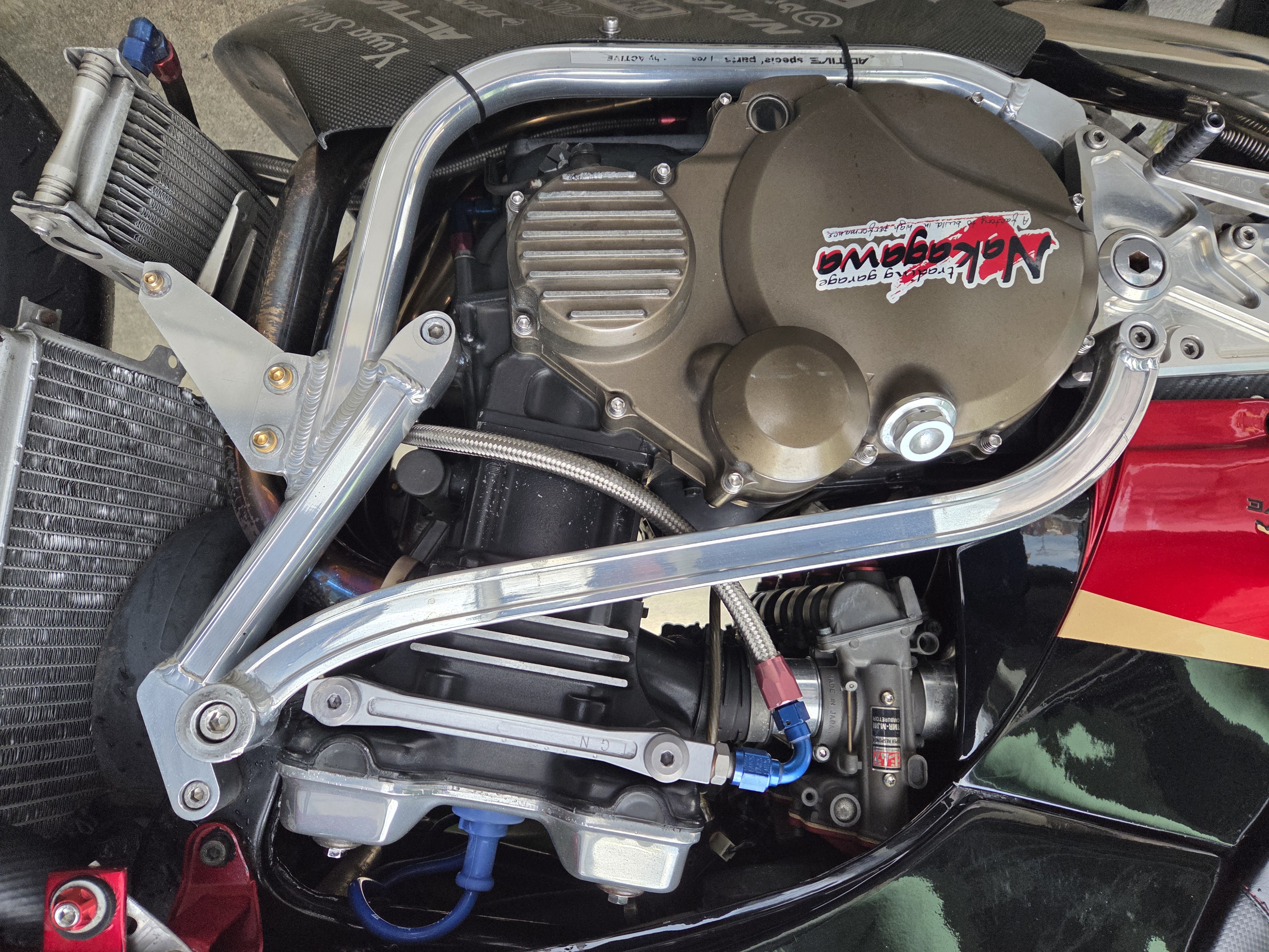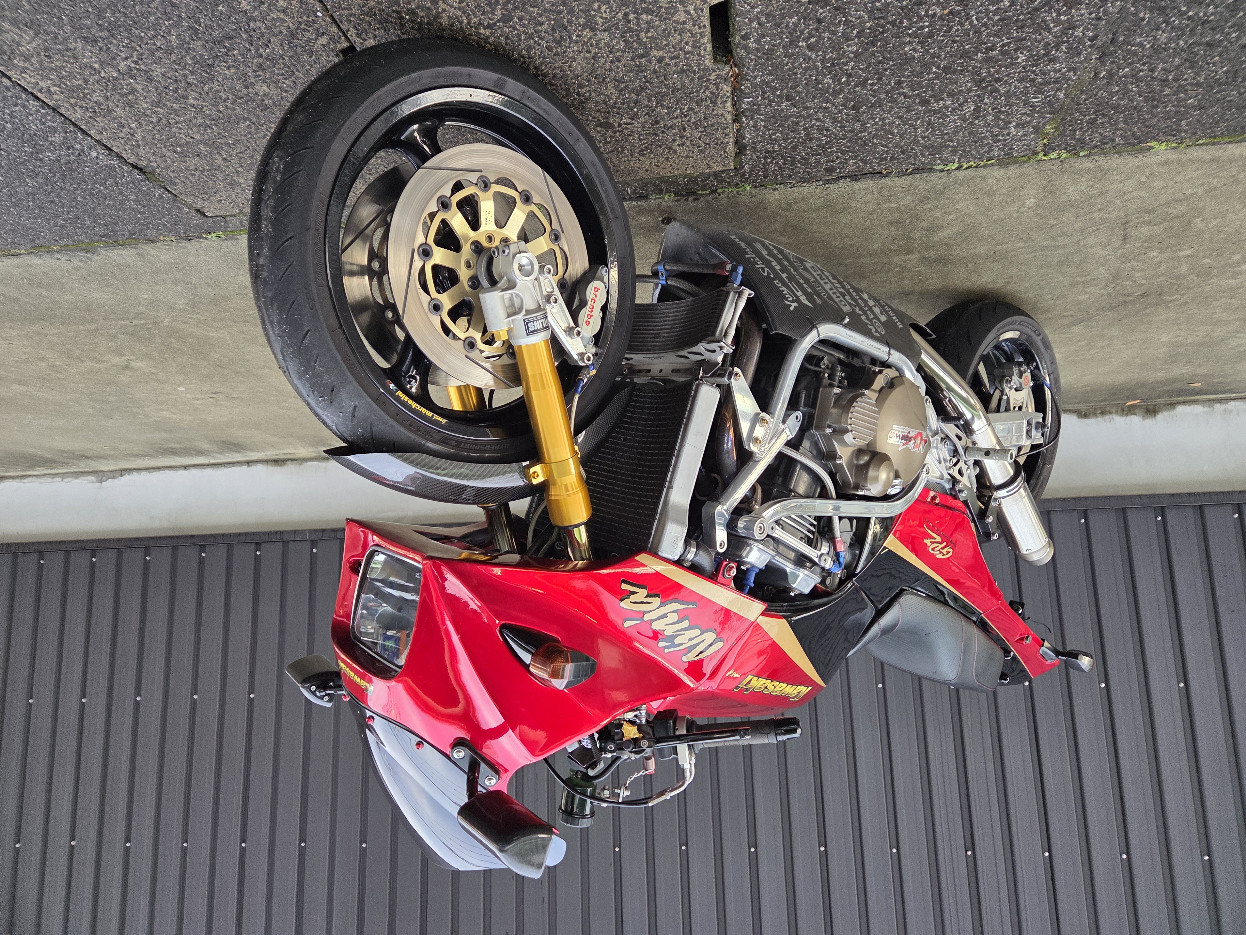 取付パーツ・マルケジーニM3R,ヨシムラTMR,前後オーリンズ、プロト17インチ用スイングアーム、NITROサイレンサー、FRブレンボキャリパー、Defiタコメーター、ETC,ウオタニSP2、ブレンボブレーキ&クラッチマスターシリンダー、オーバーバックステップ、アクティブダウンチューブ、マーベラスオリジナルシートフレーム、マーベラススクリーン、スペックエンジニアリング削り出しステムキット、FRPの外装一式タンクカバー他パーツ多数付
