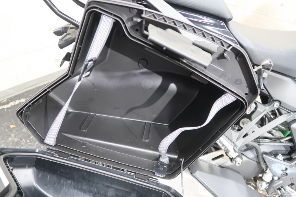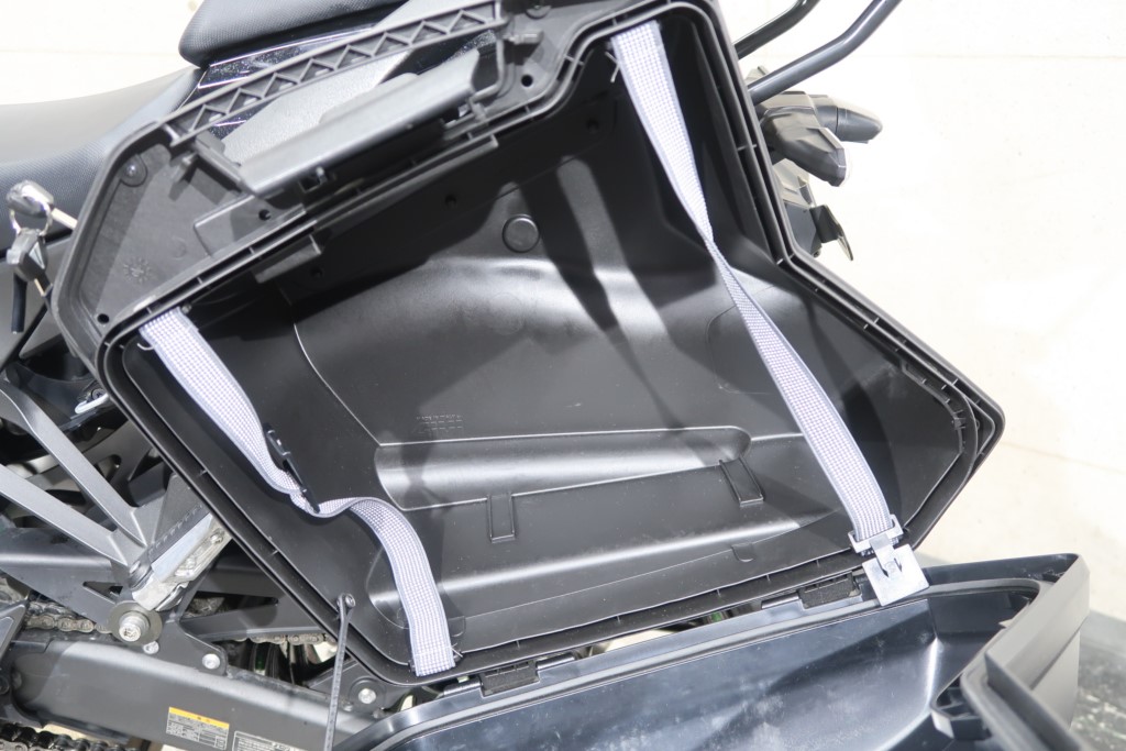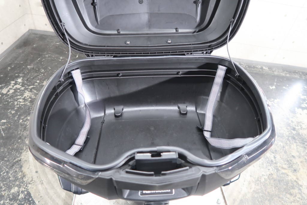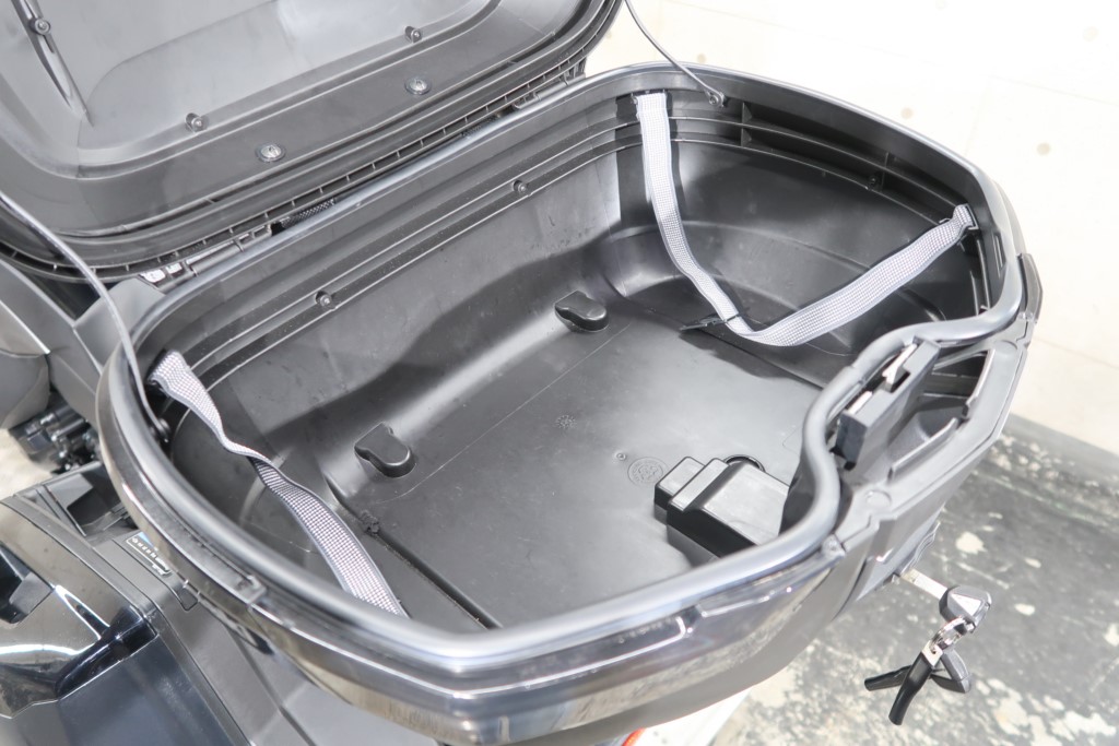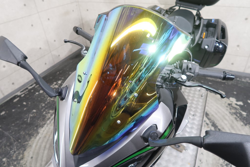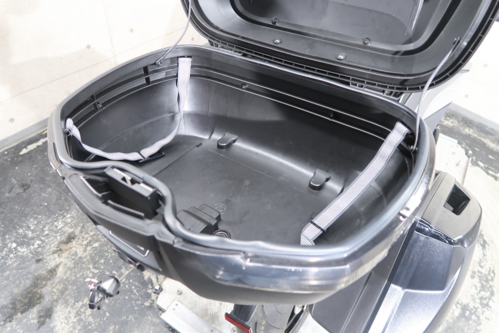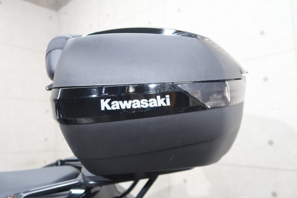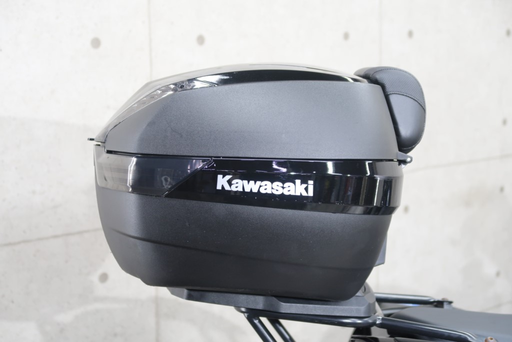 オプションパニアケースキット(186,208円)、社外リアキャリア、トップボックス(バックレストパッド付)、マルチバー、ミラースクリーン。