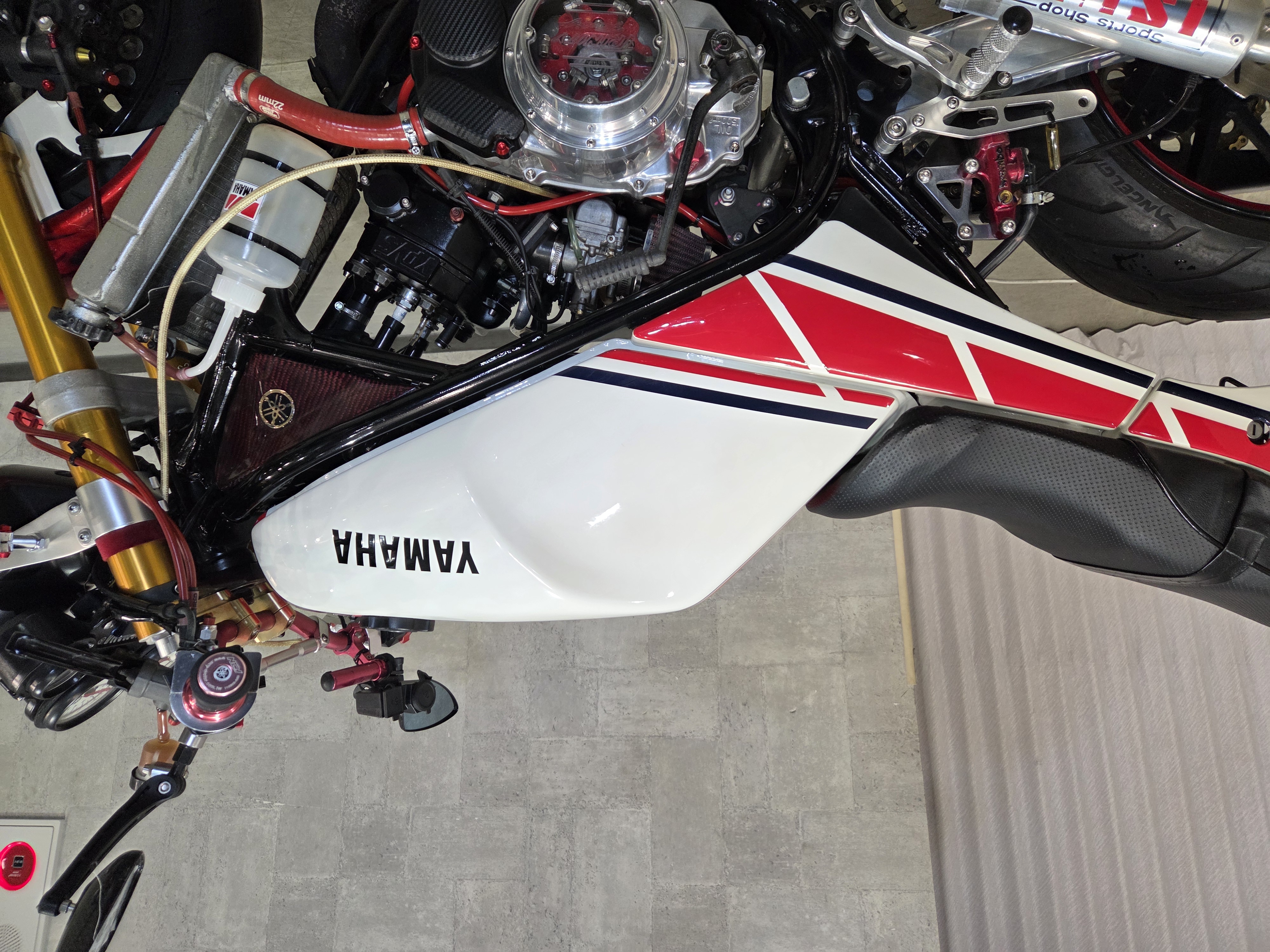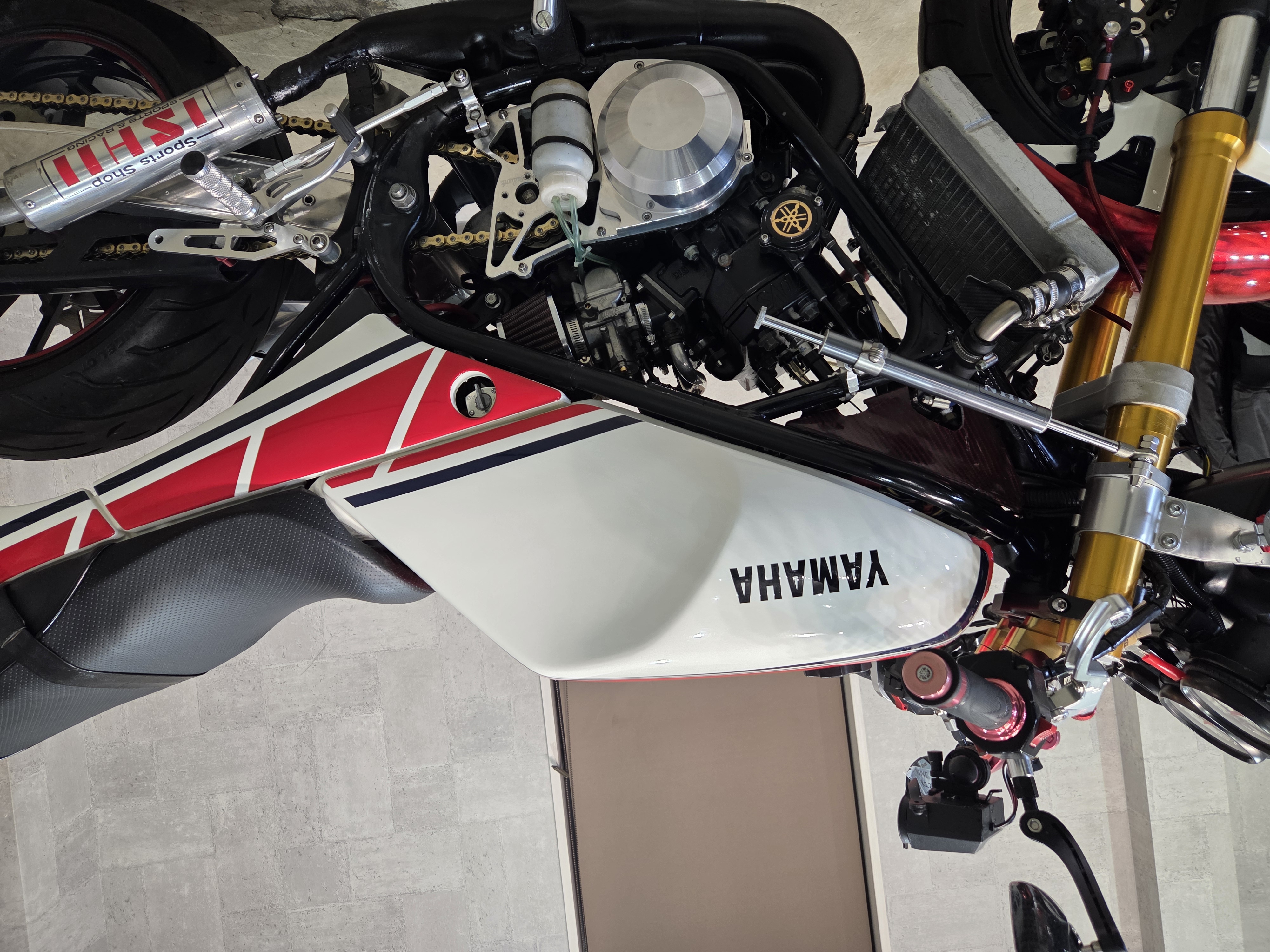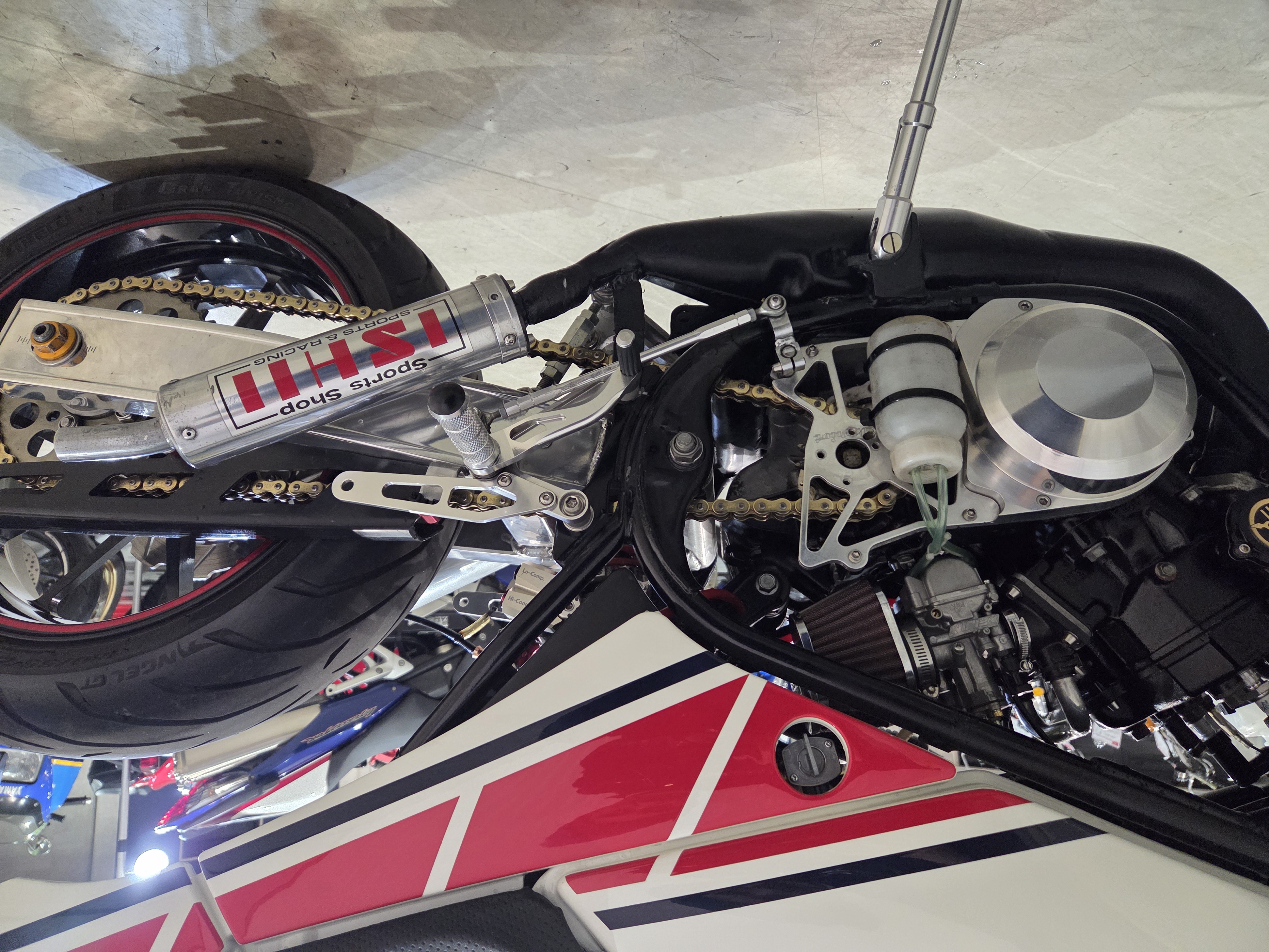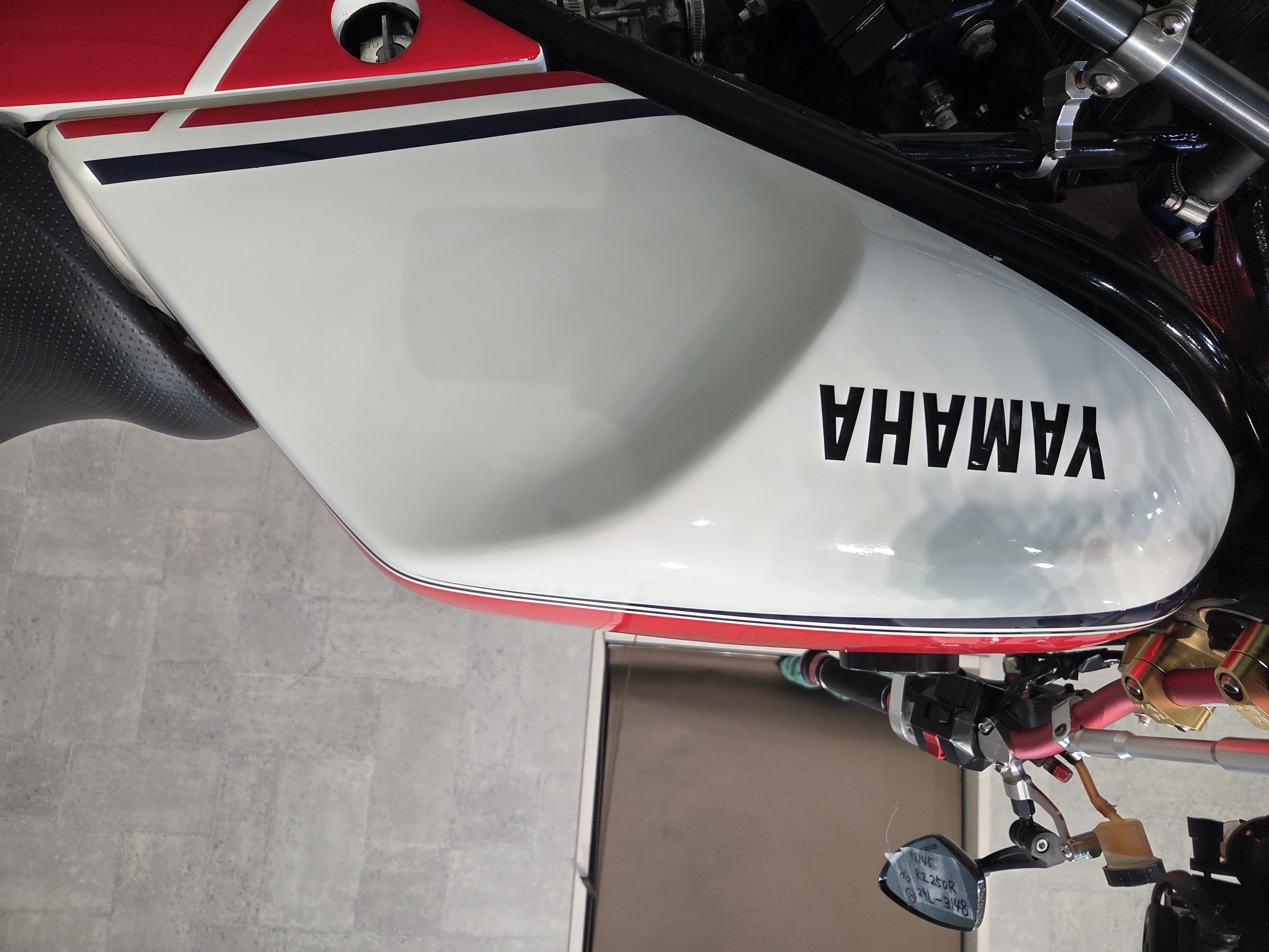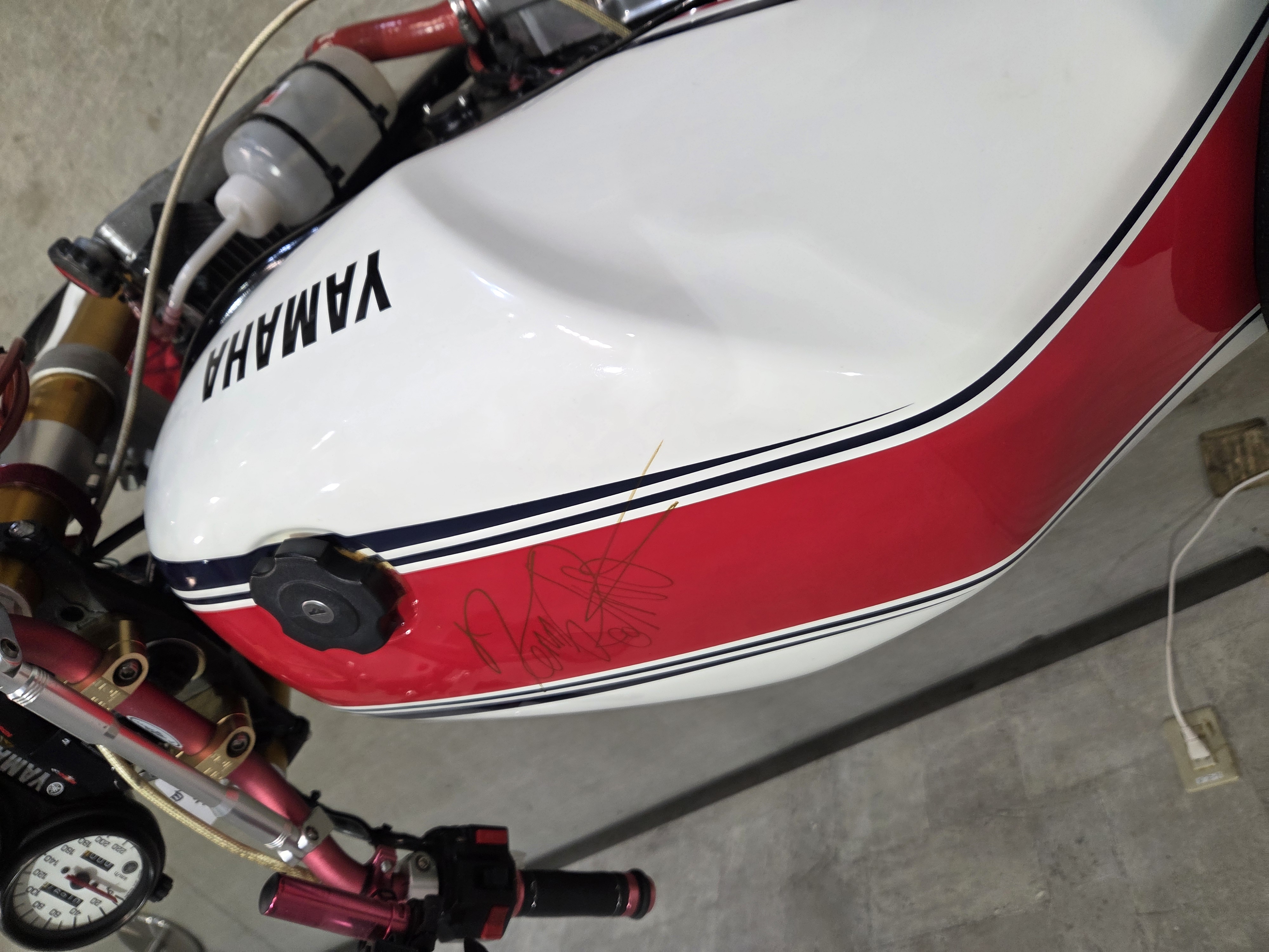 カスタムパーツ・SSイシイチャンバー、PWK28キャブ、エンジン350cc換装、オイルポンプ350用、YSSリアショック、フロント周りYZFR1流用、6ポッドキャリパー、ブレーキローター、スイングアームFZ6流用、キャリパー、ブレーキローター、前後ホイール、OSRCDI、リアフェンダーレス、ロックアップクラッチ、ケースカバー、アップハンドル、バックステップ、ストロボカラー・プロショップ全塗装、タンク上部キング・ケニー・ロバーツ氏の直筆サイン入り