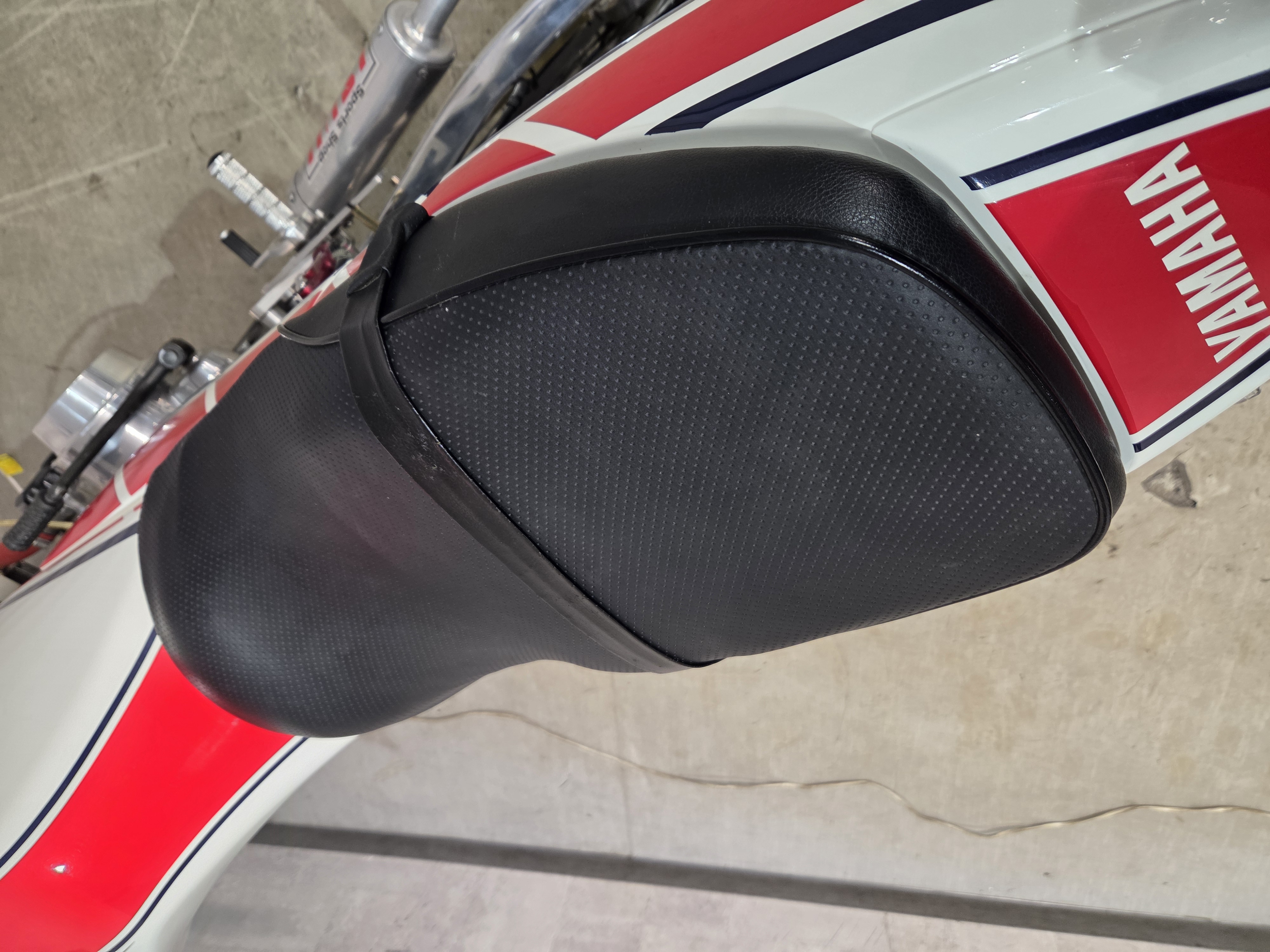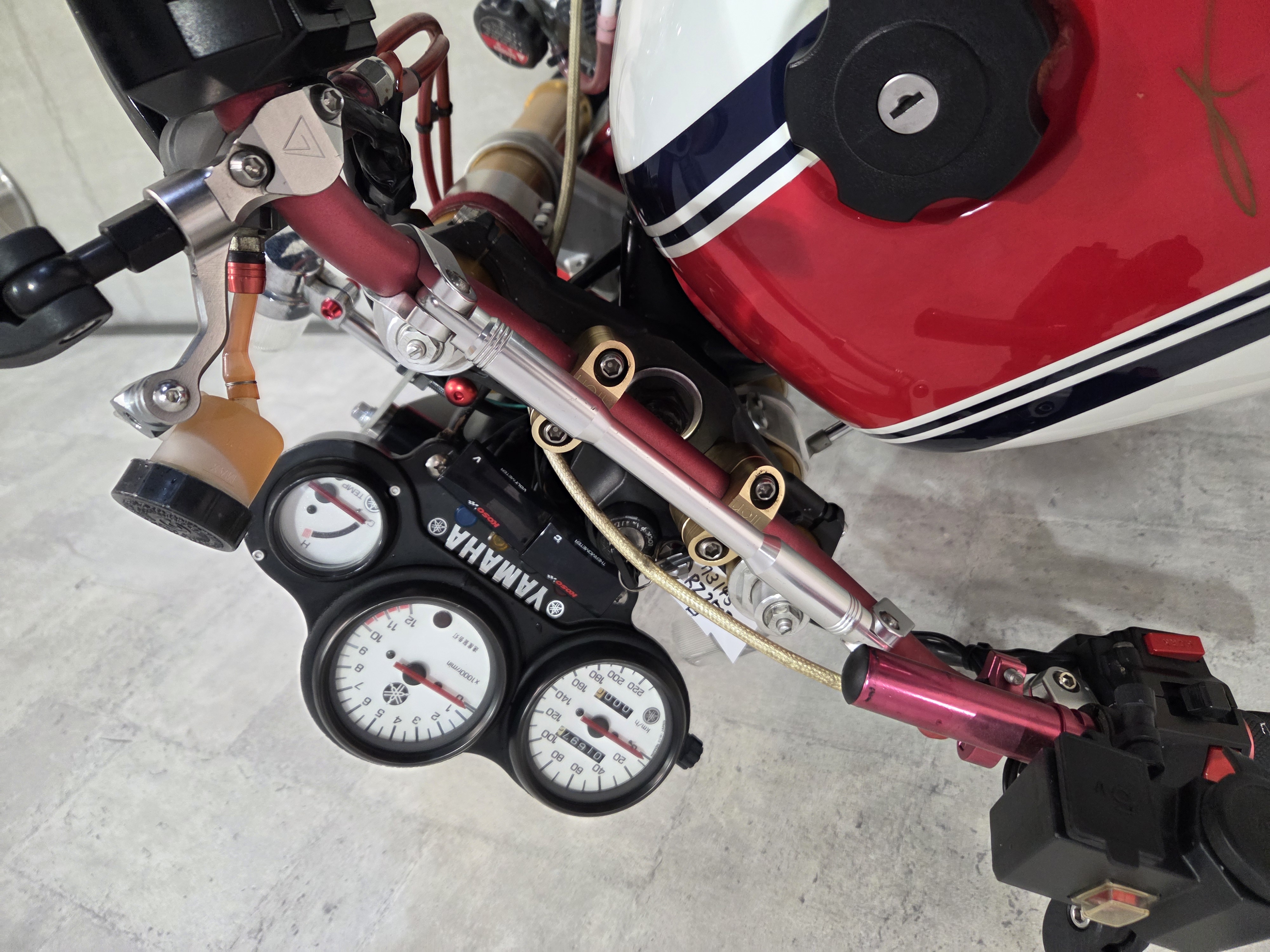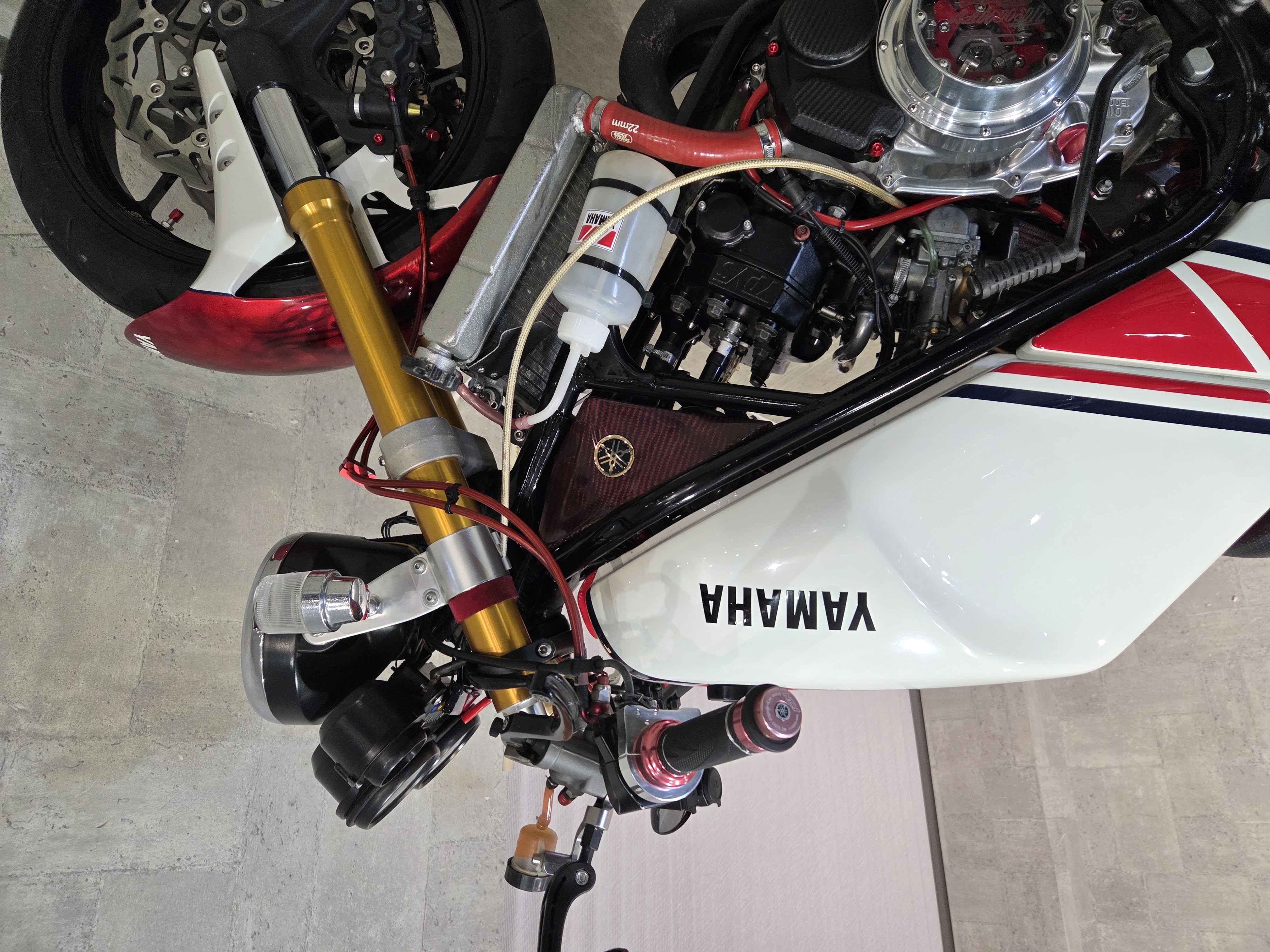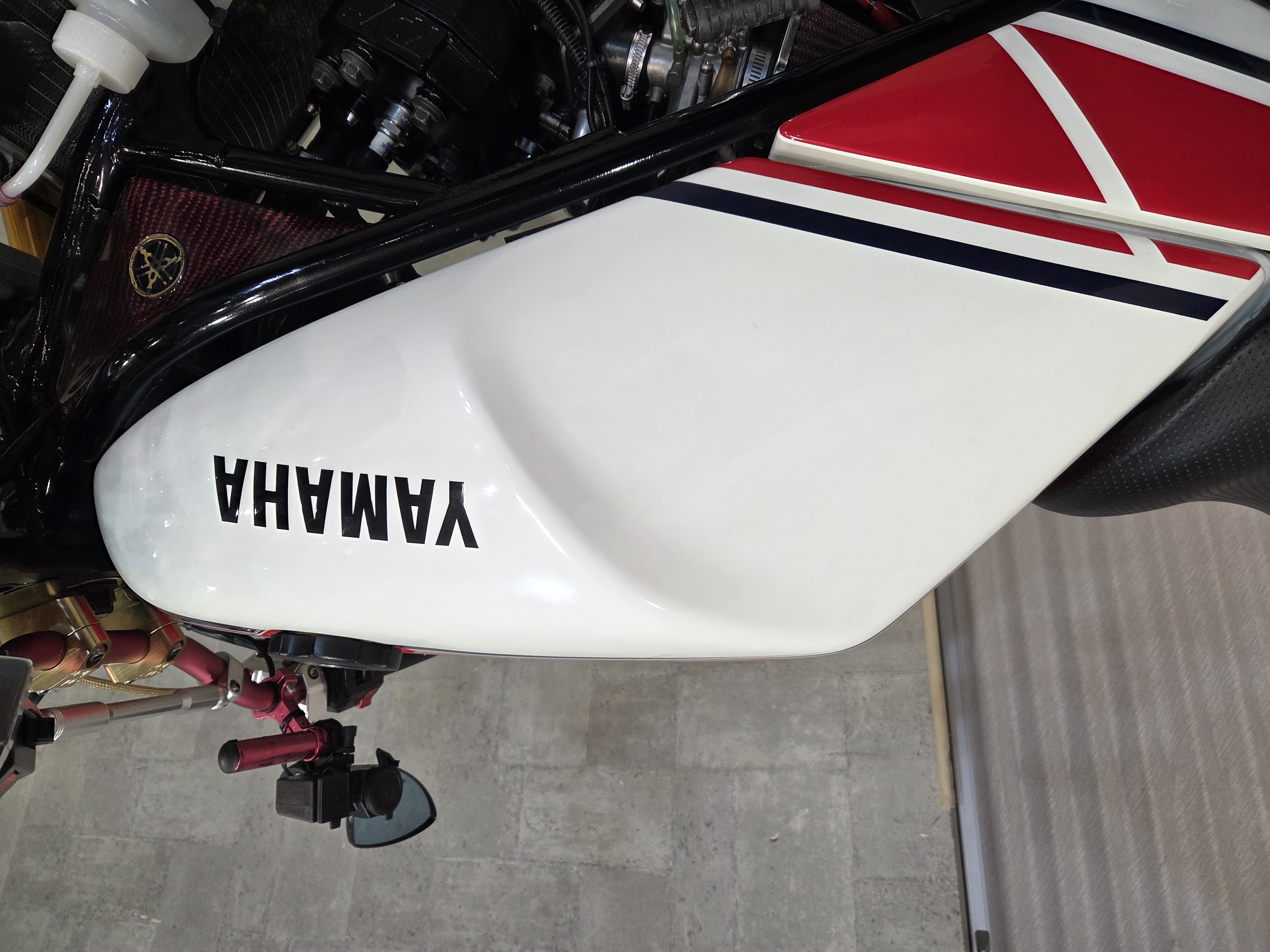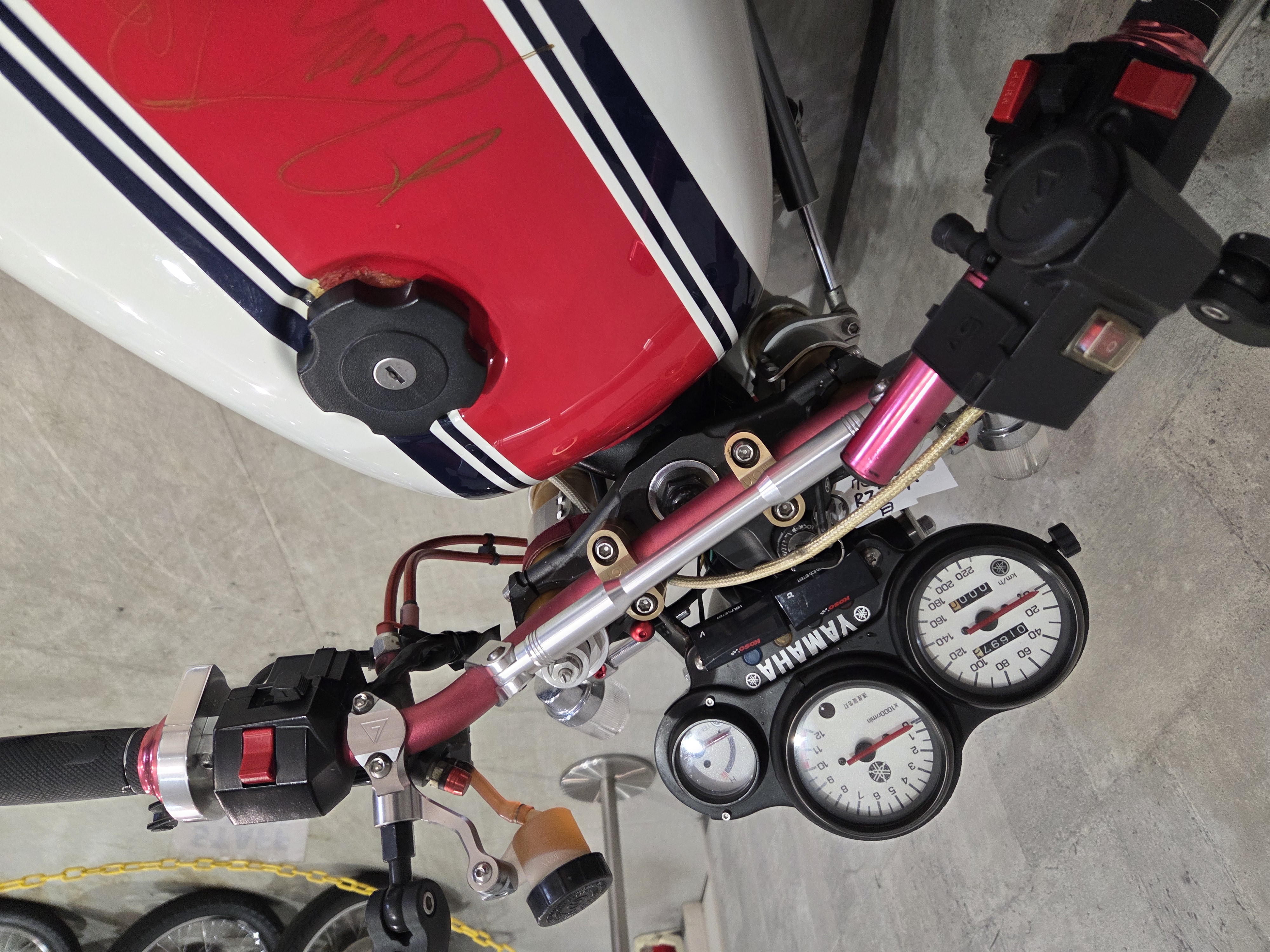 カスタムパーツ・SSイシイチャンバー、PWK28キャブ、エンジン350cc換装、オイルポンプ350用、YSSリアショック、フロント周りYZFR1流用、6ポッドキャリパー、ブレーキローター、スイングアームFZ6流用、キャリパー、ブレーキローター、前後ホイール、OSRCDI、リアフェンダーレス、ロックアップクラッチ、ケースカバー、アップハンドル、バックステップ、ストロボカラー・プロショップ全塗装、タンク上部キング・ケニー・ロバーツ氏の直筆サイン入り