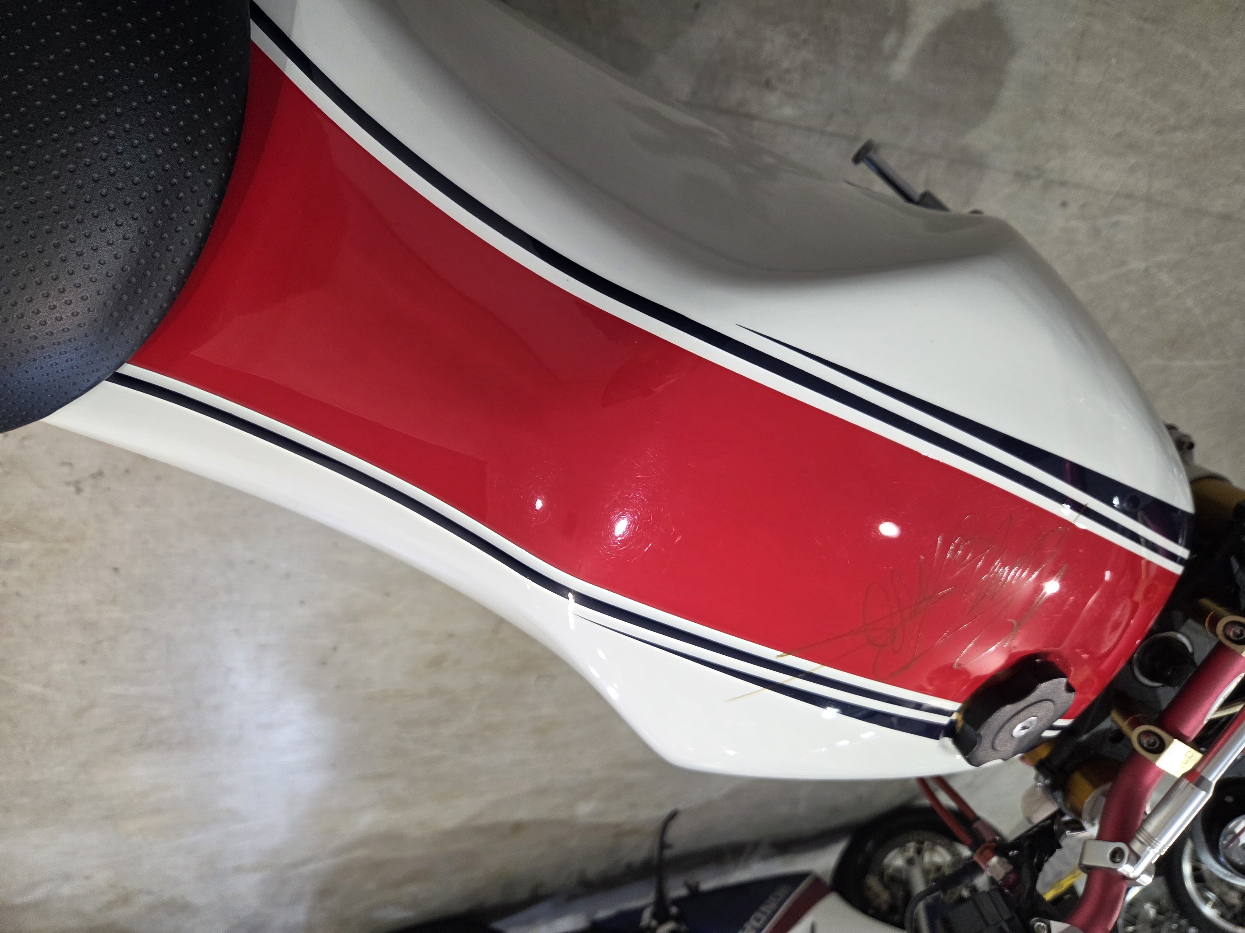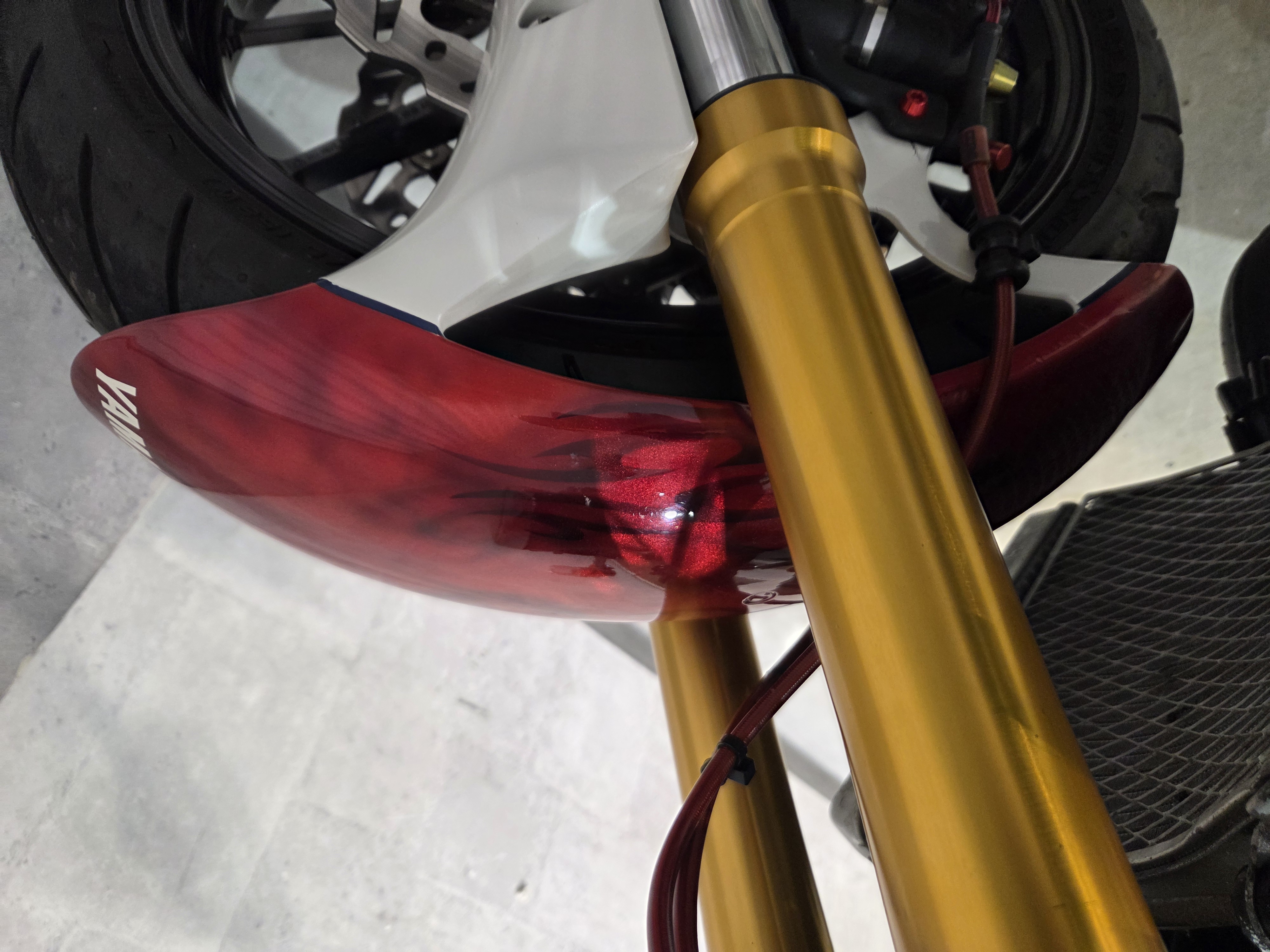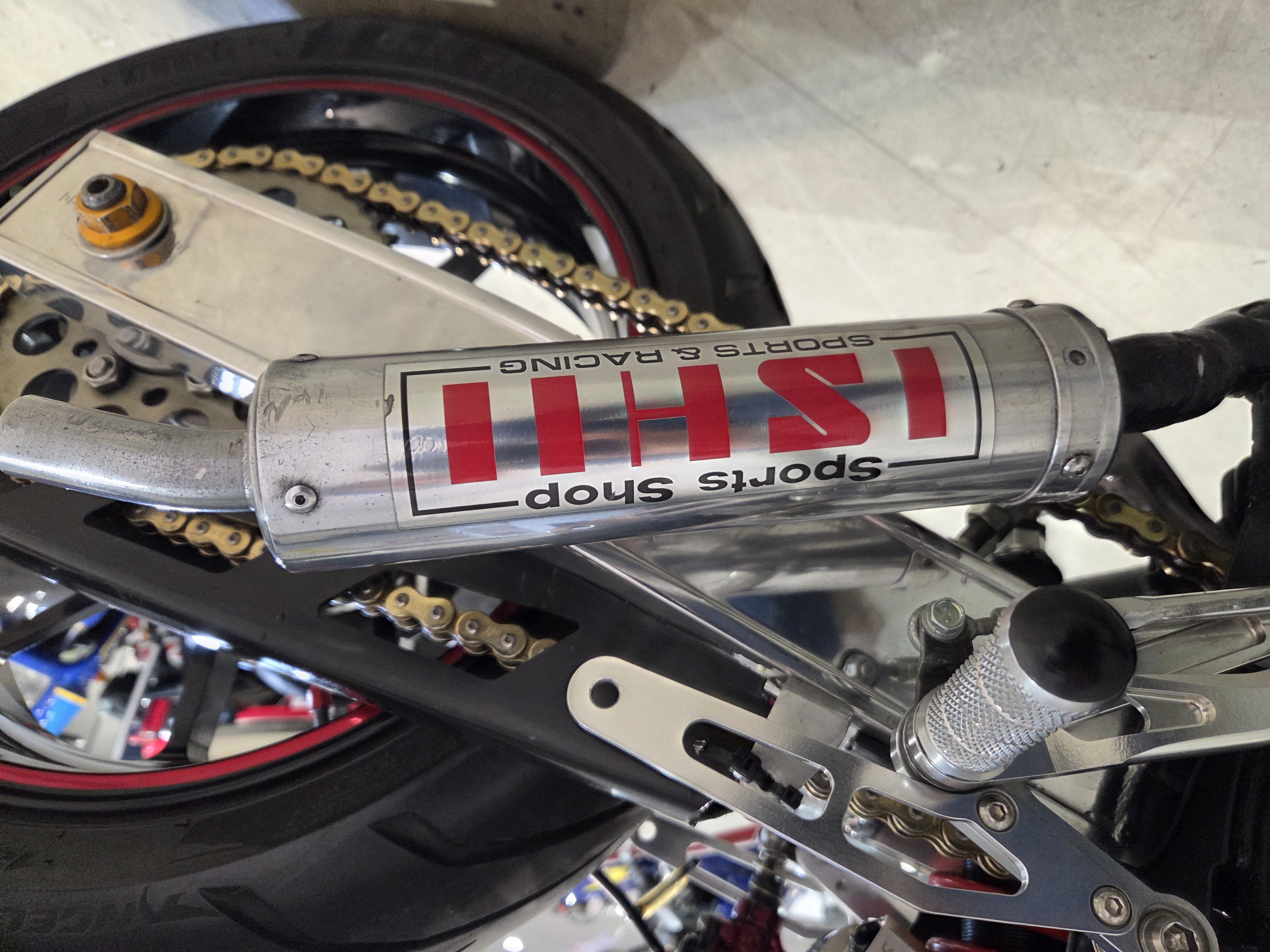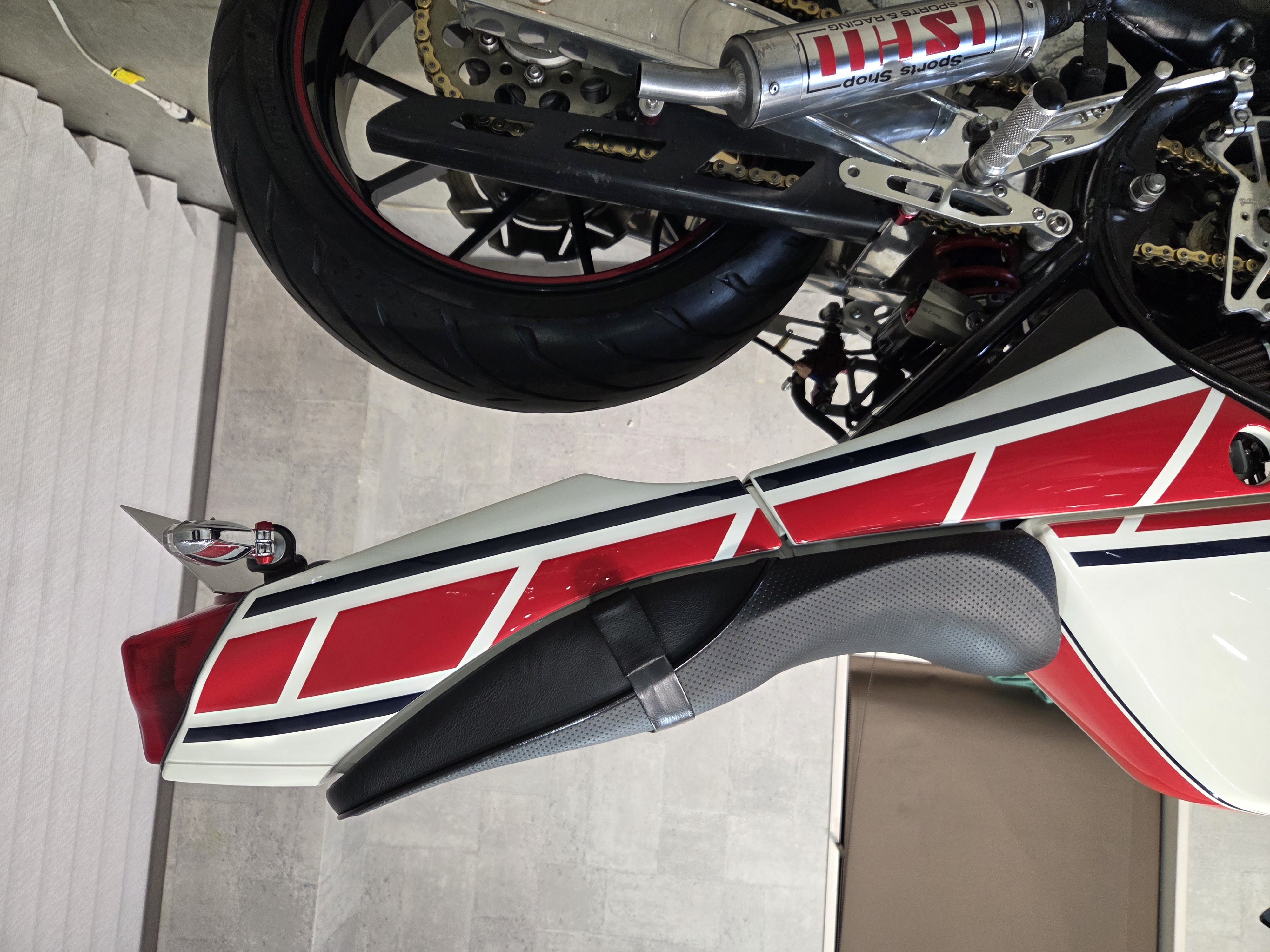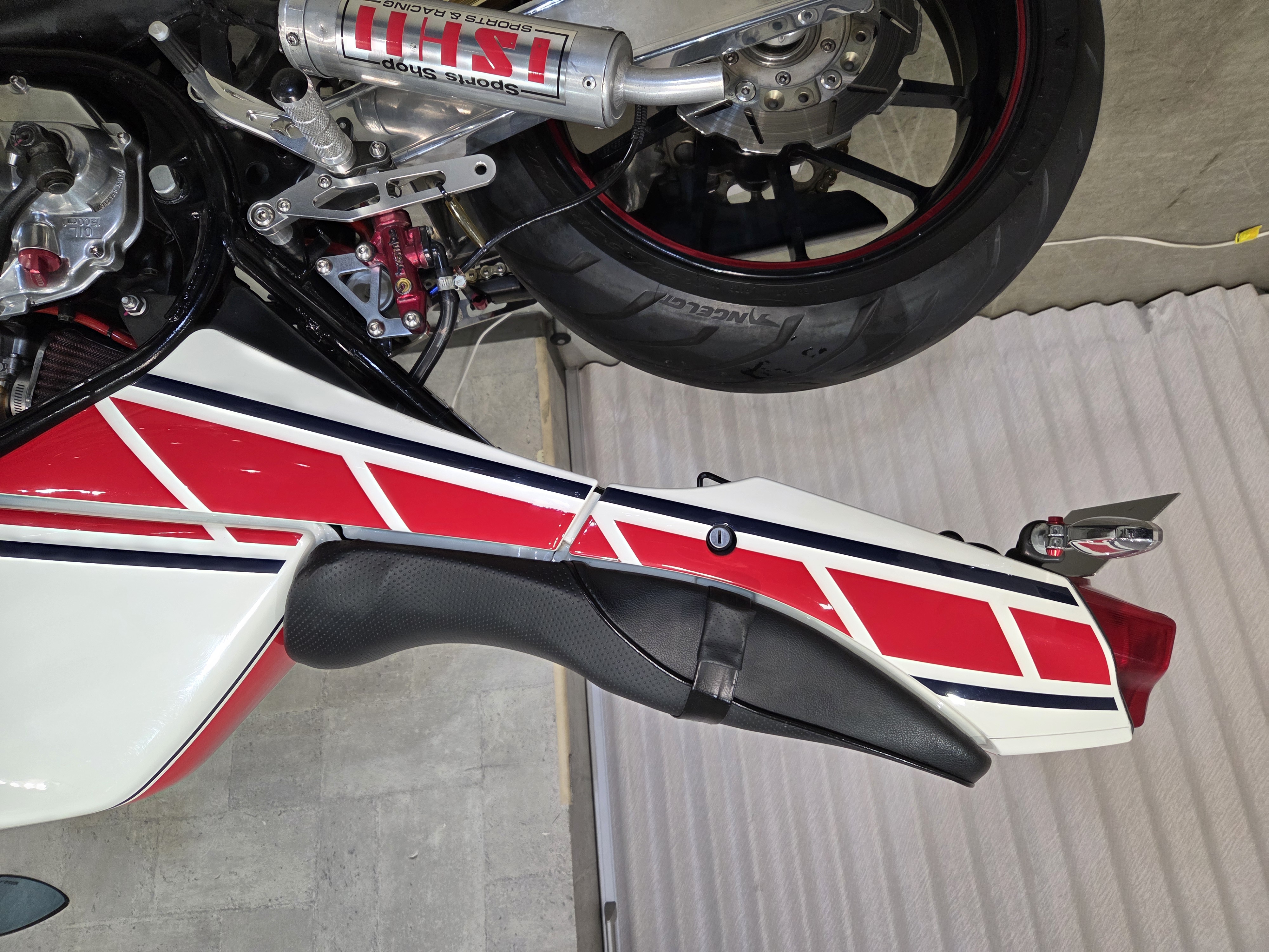 カスタムパーツ・SSイシイチャンバー、PWK28キャブ、エンジン350cc換装、オイルポンプ350用、YSSリアショック、フロント周りYZFR1流用、6ポッドキャリパー、ブレーキローター、スイングアームFZ6流用、キャリパー、ブレーキローター、前後ホイール、OSRCDI、リアフェンダーレス、ロックアップクラッチ、ケースカバー、アップハンドル、バックステップ、ストロボカラー・プロショップ全塗装、タンク上部キング・ケニー・ロバーツ氏の直筆サイン入り