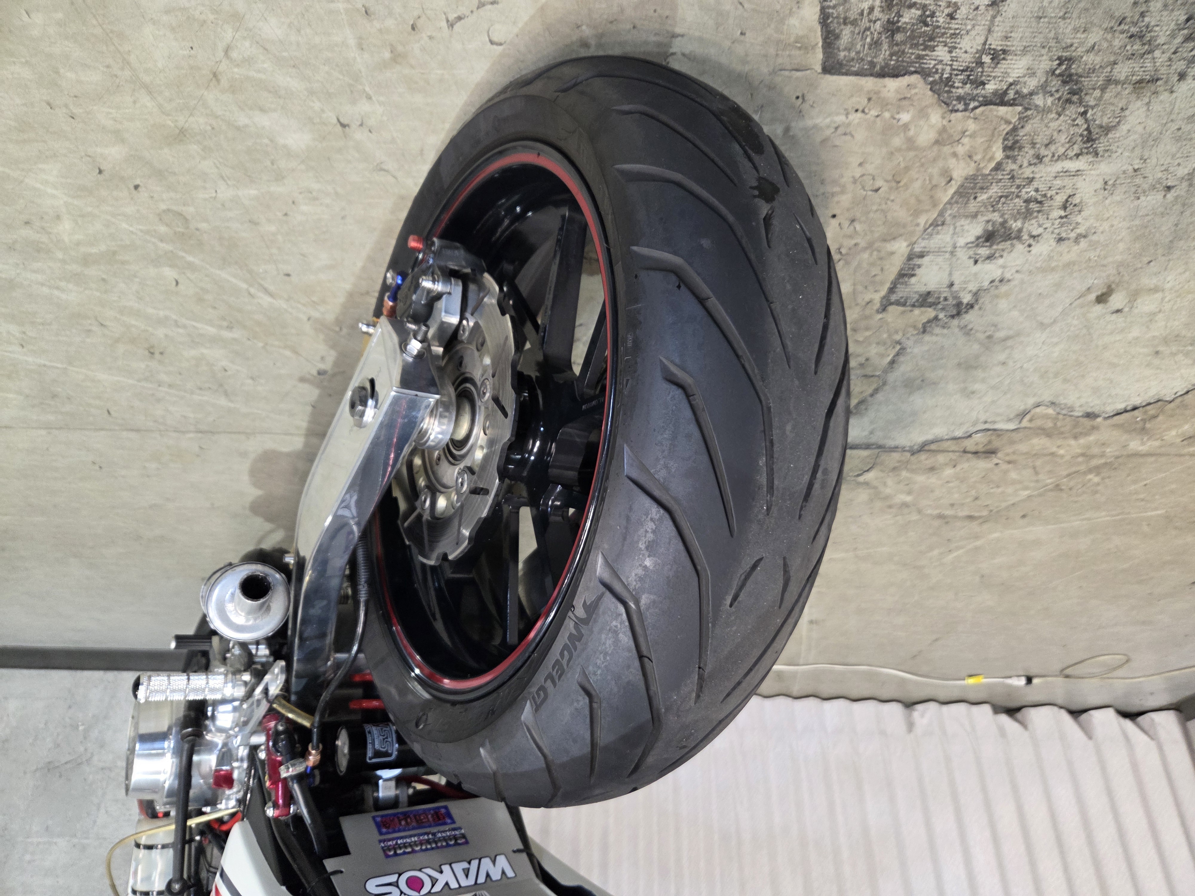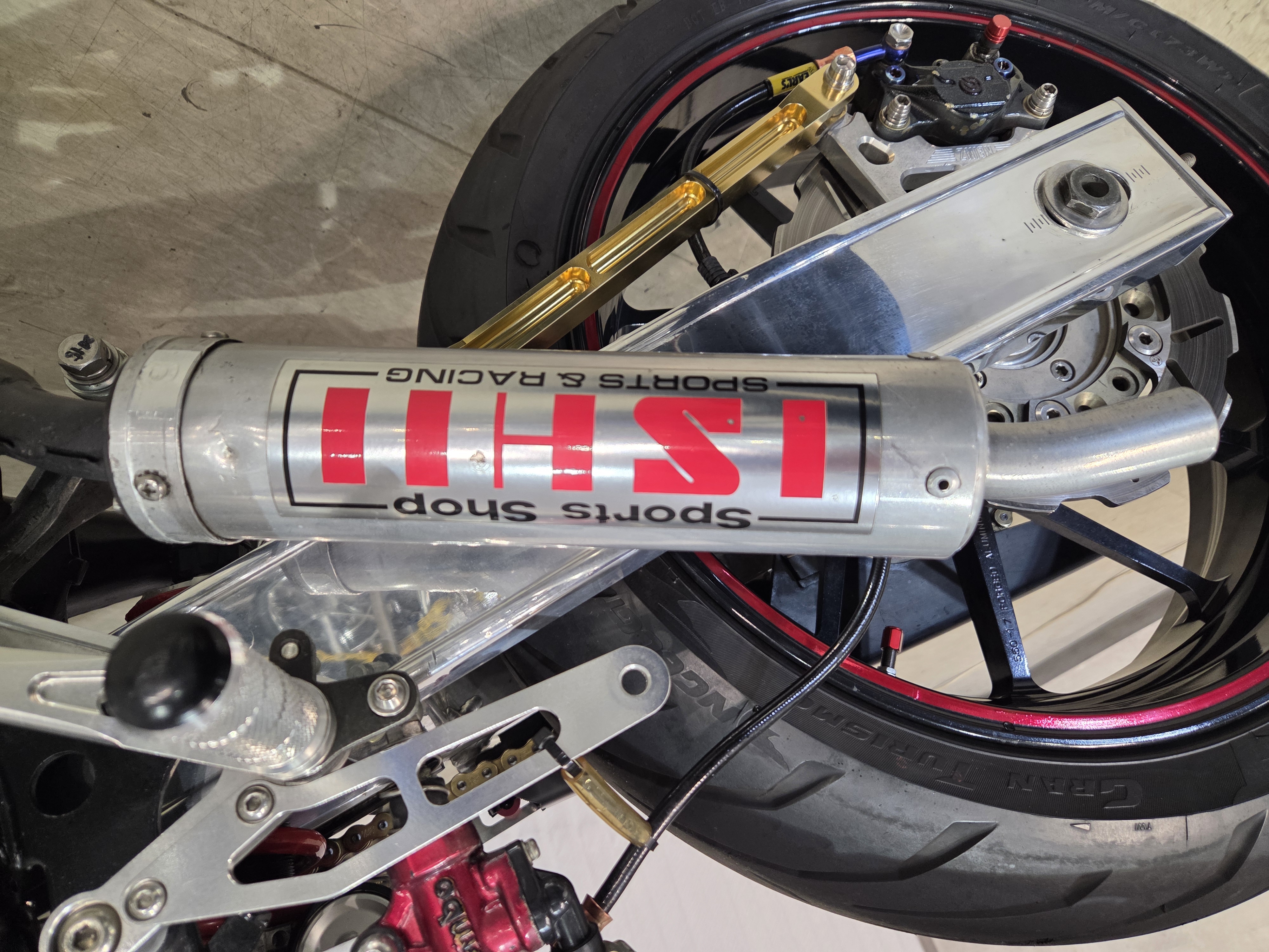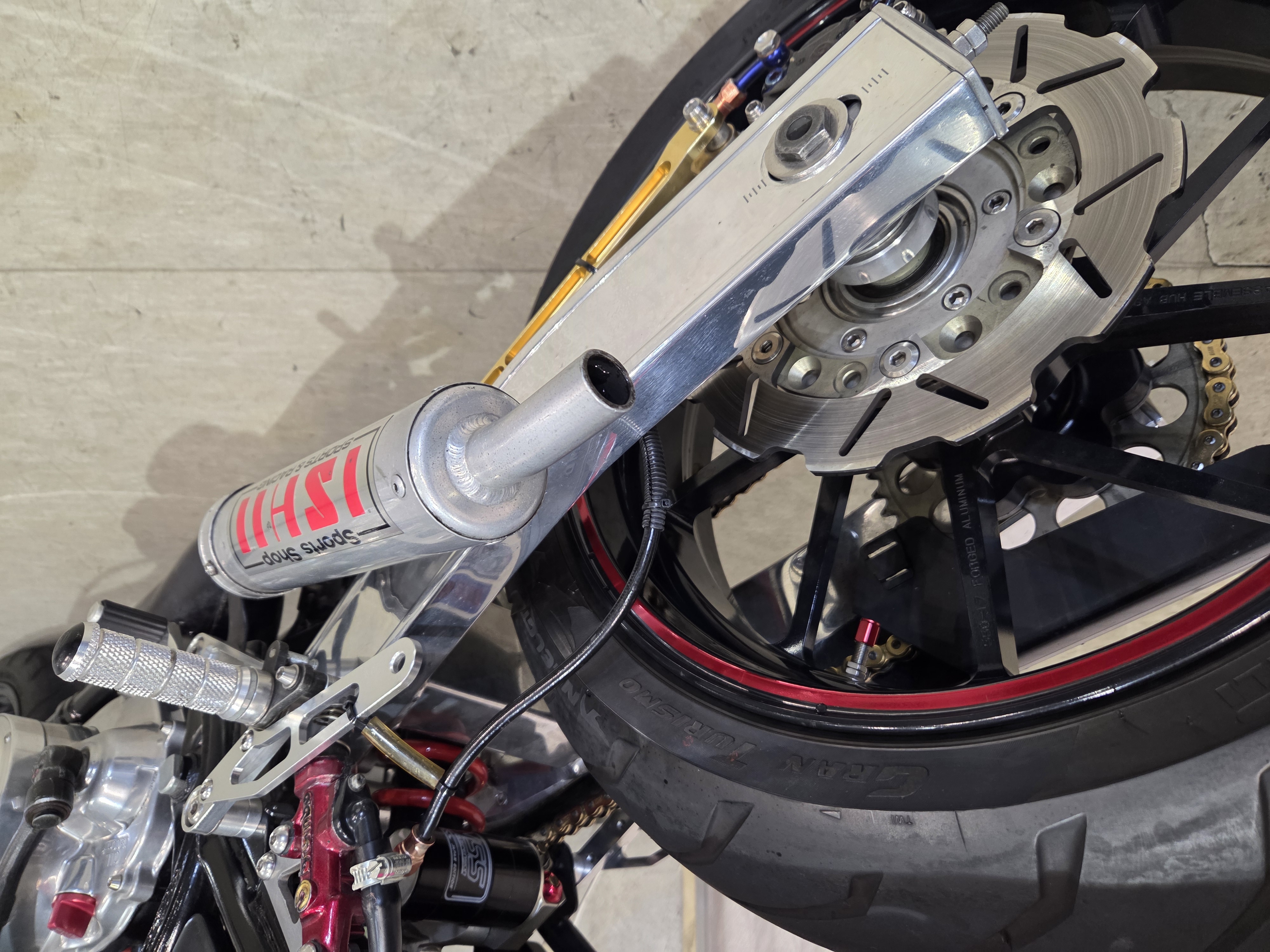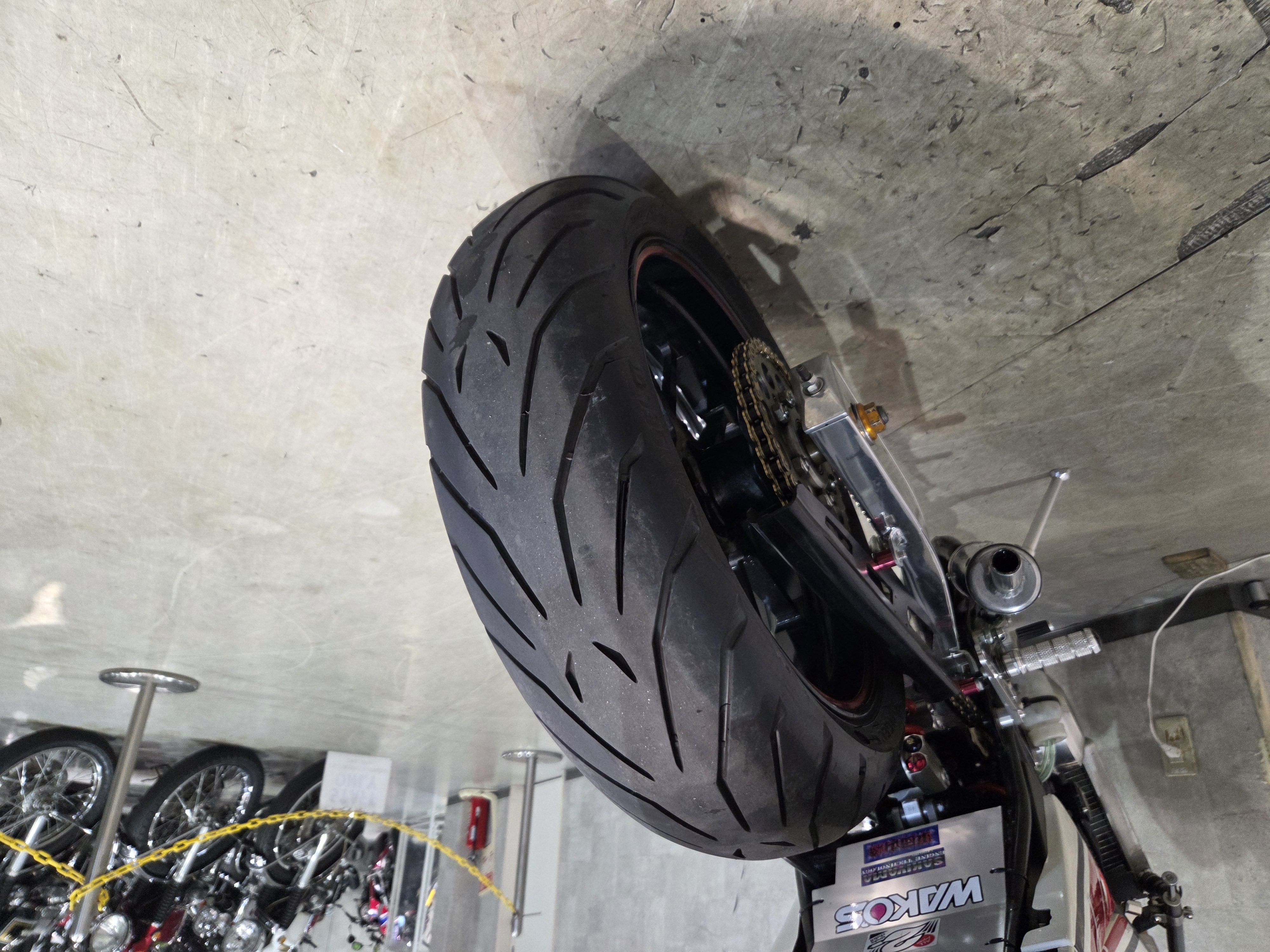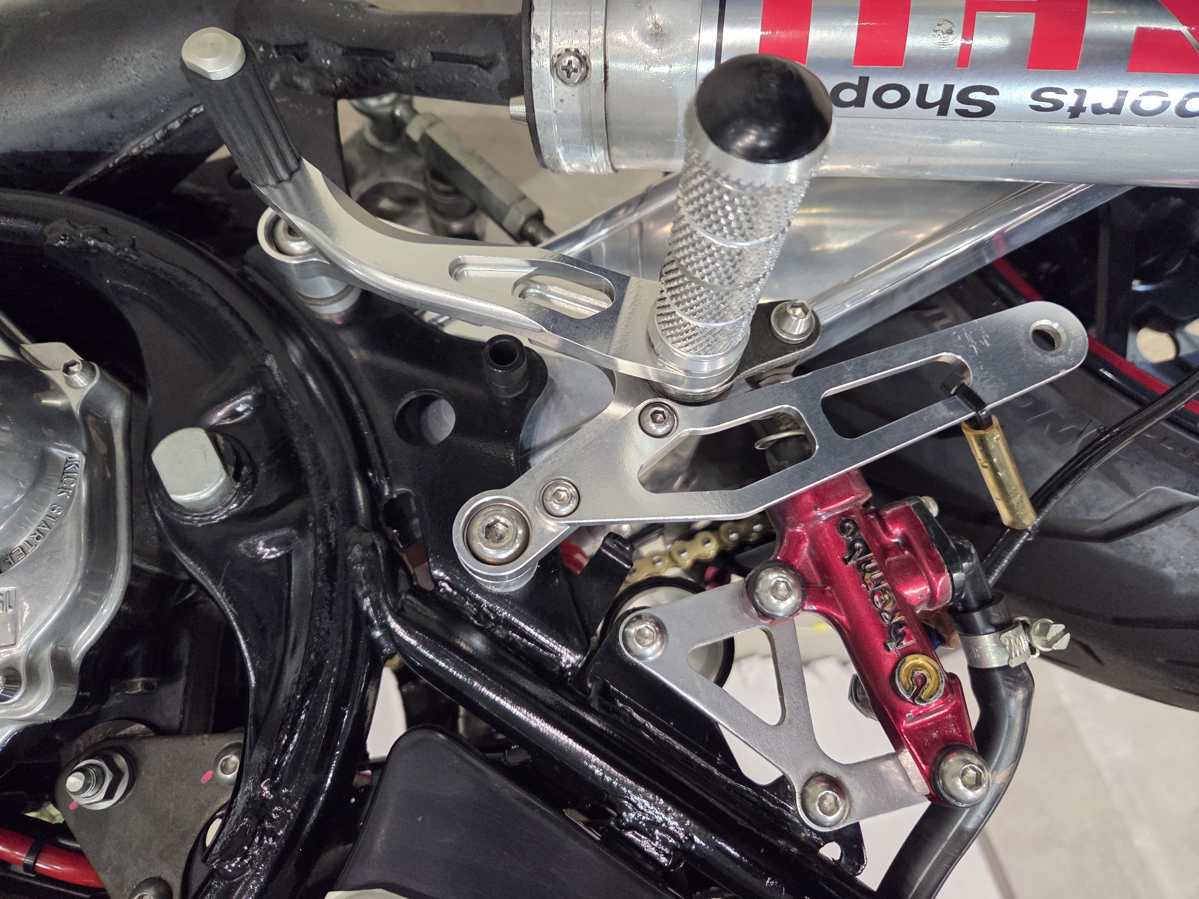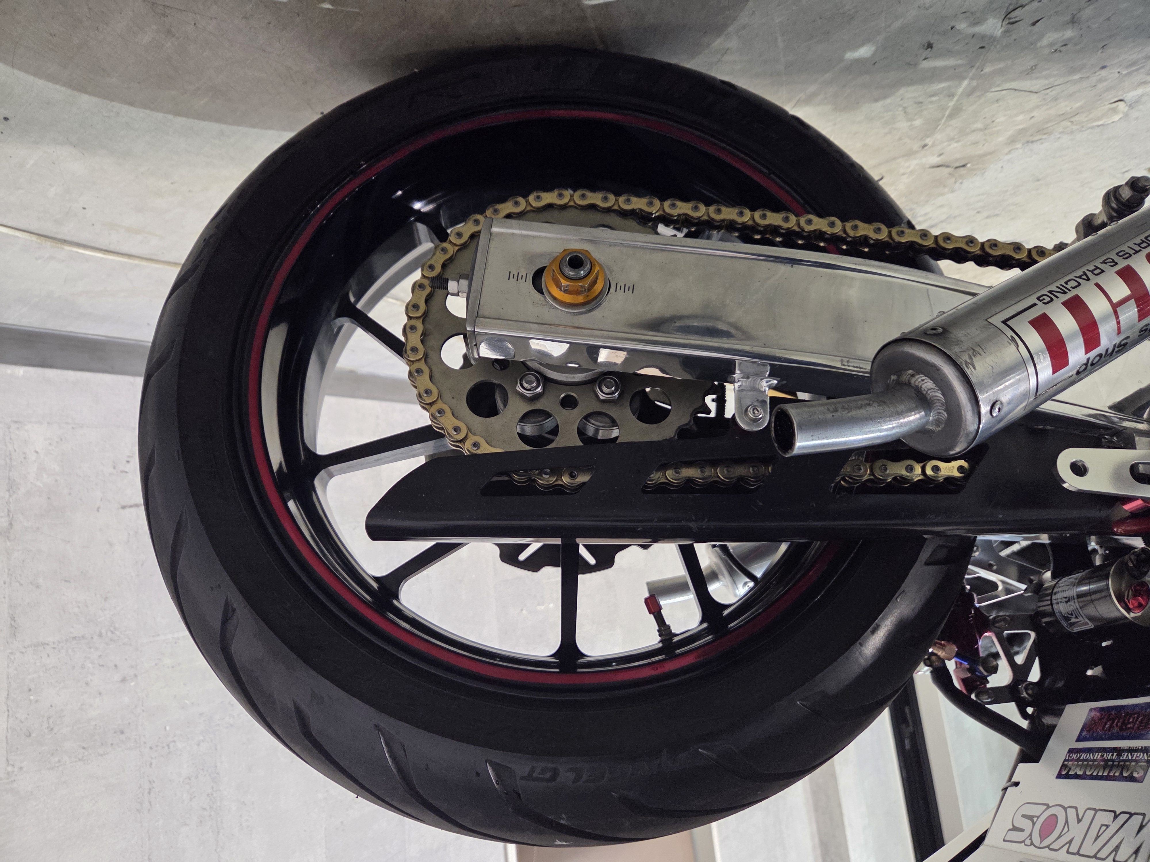 カスタムパーツ・SSイシイチャンバー、PWK28キャブ、エンジン350cc換装、オイルポンプ350用、YSSリアショック、フロント周りYZFR1流用、6ポッドキャリパー、ブレーキローター、スイングアームFZ6流用、キャリパー、ブレーキローター、前後ホイール、OSRCDI、リアフェンダーレス、ロックアップクラッチ、ケースカバー、アップハンドル、バックステップ、ストロボカラー・プロショップ全塗装、タンク上部キング・ケニー・ロバーツ氏の直筆サイン入り
