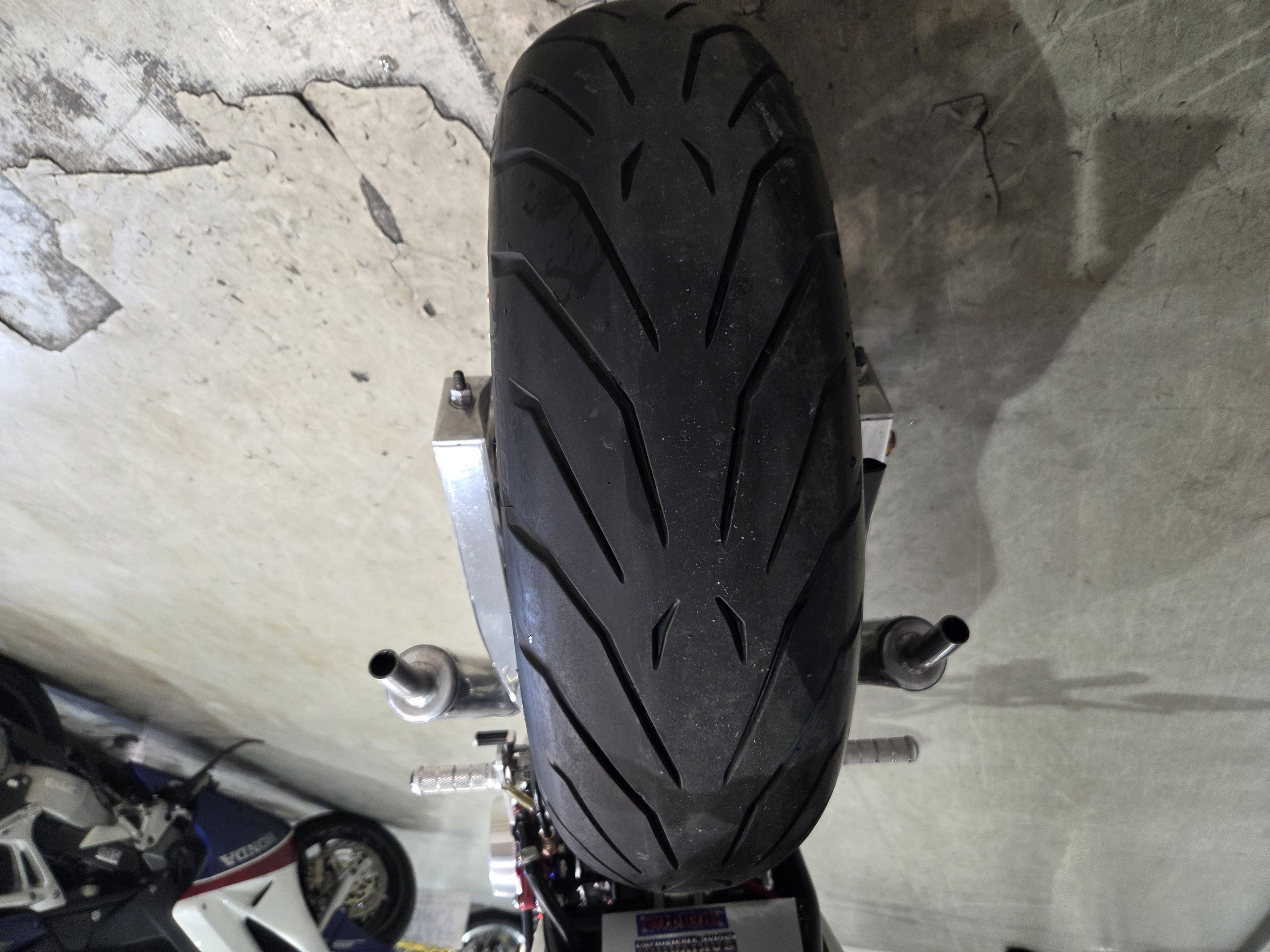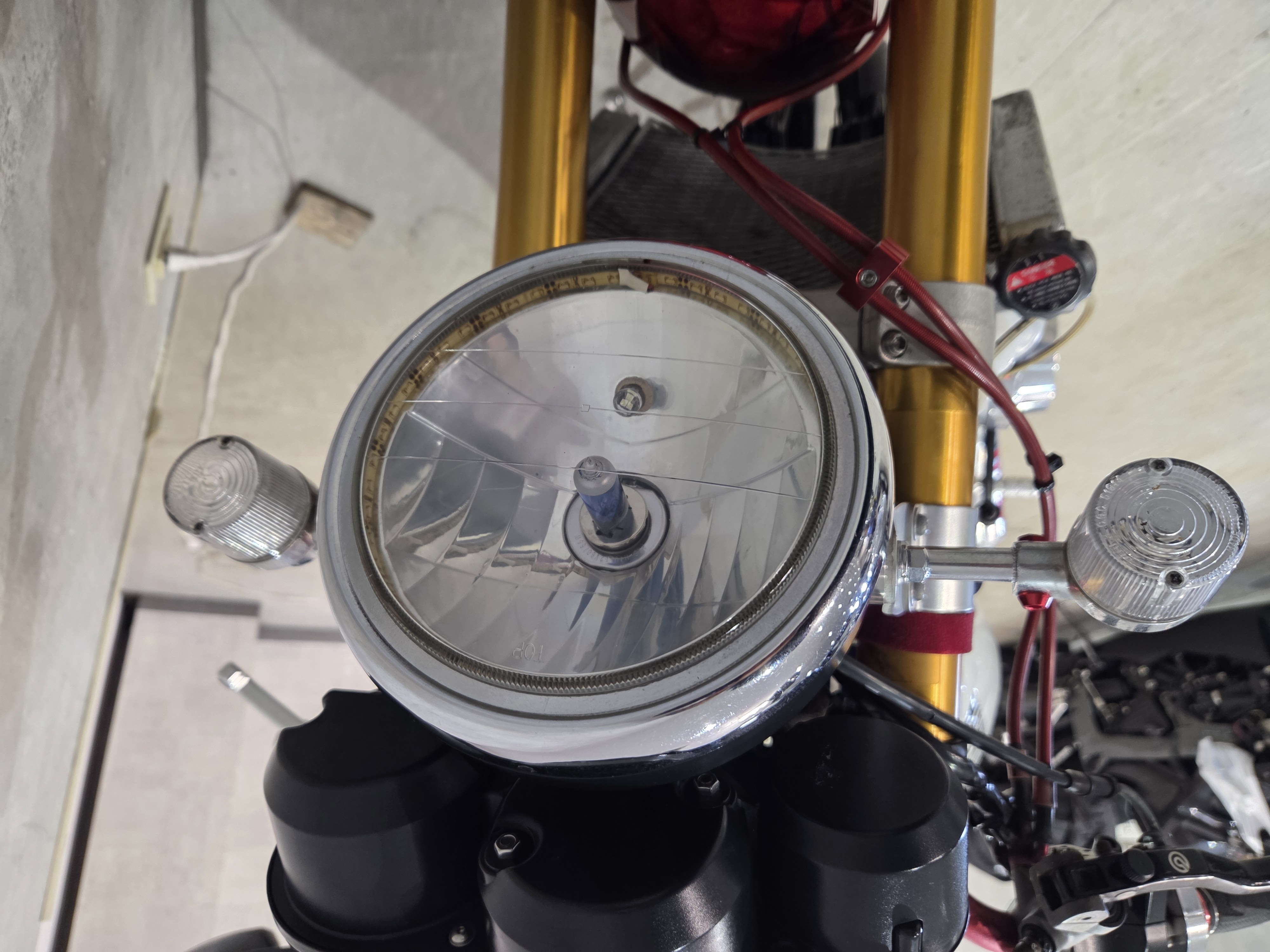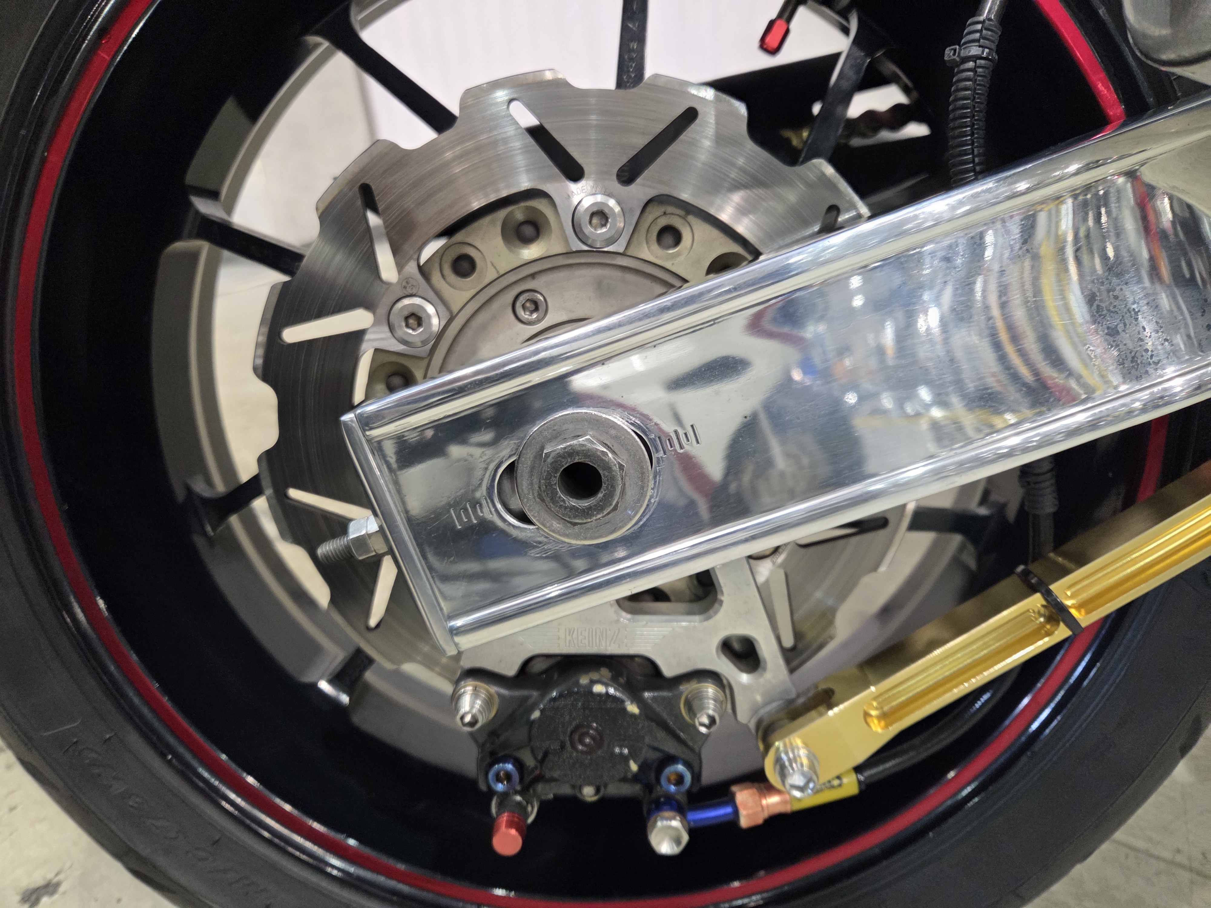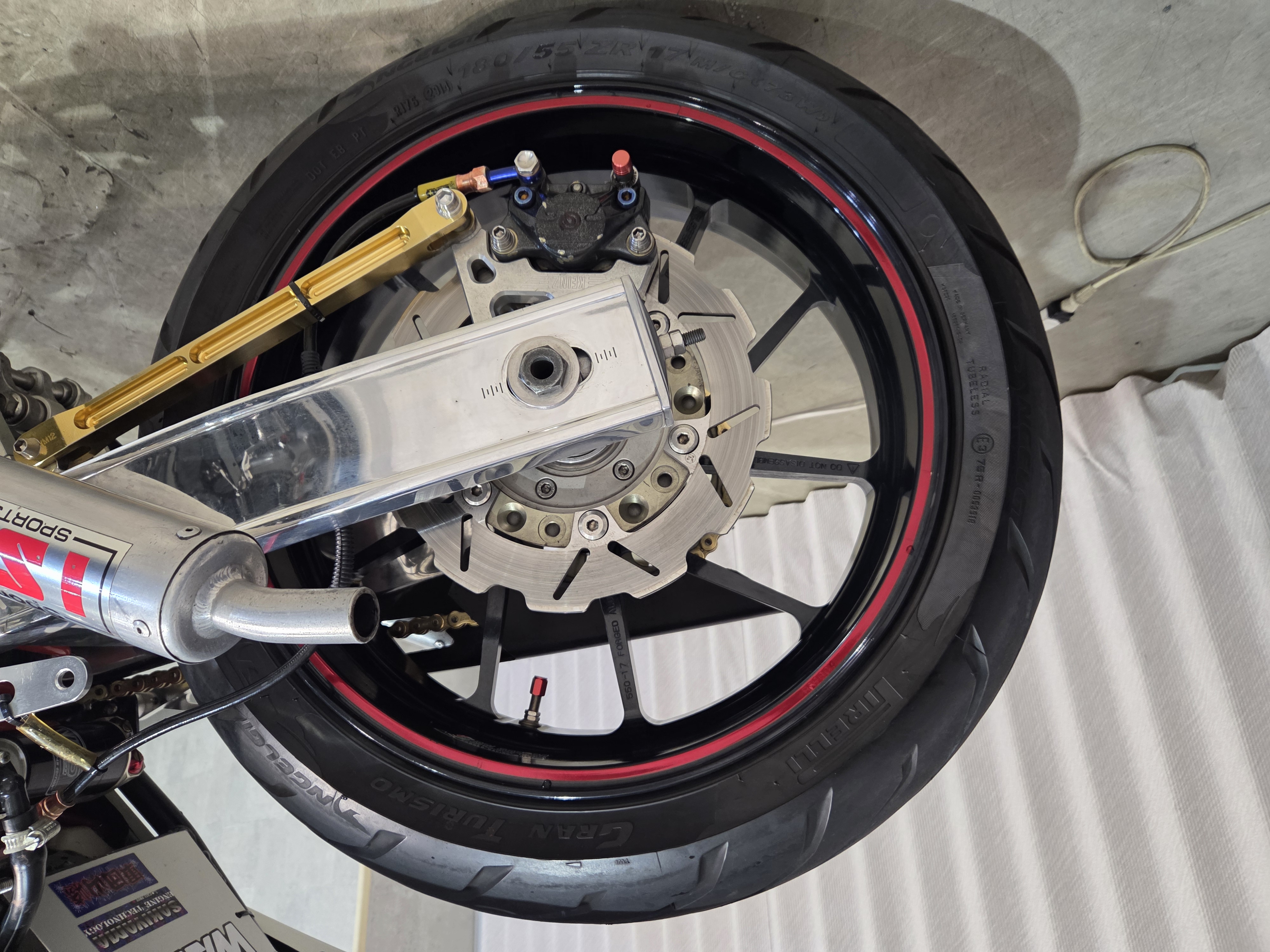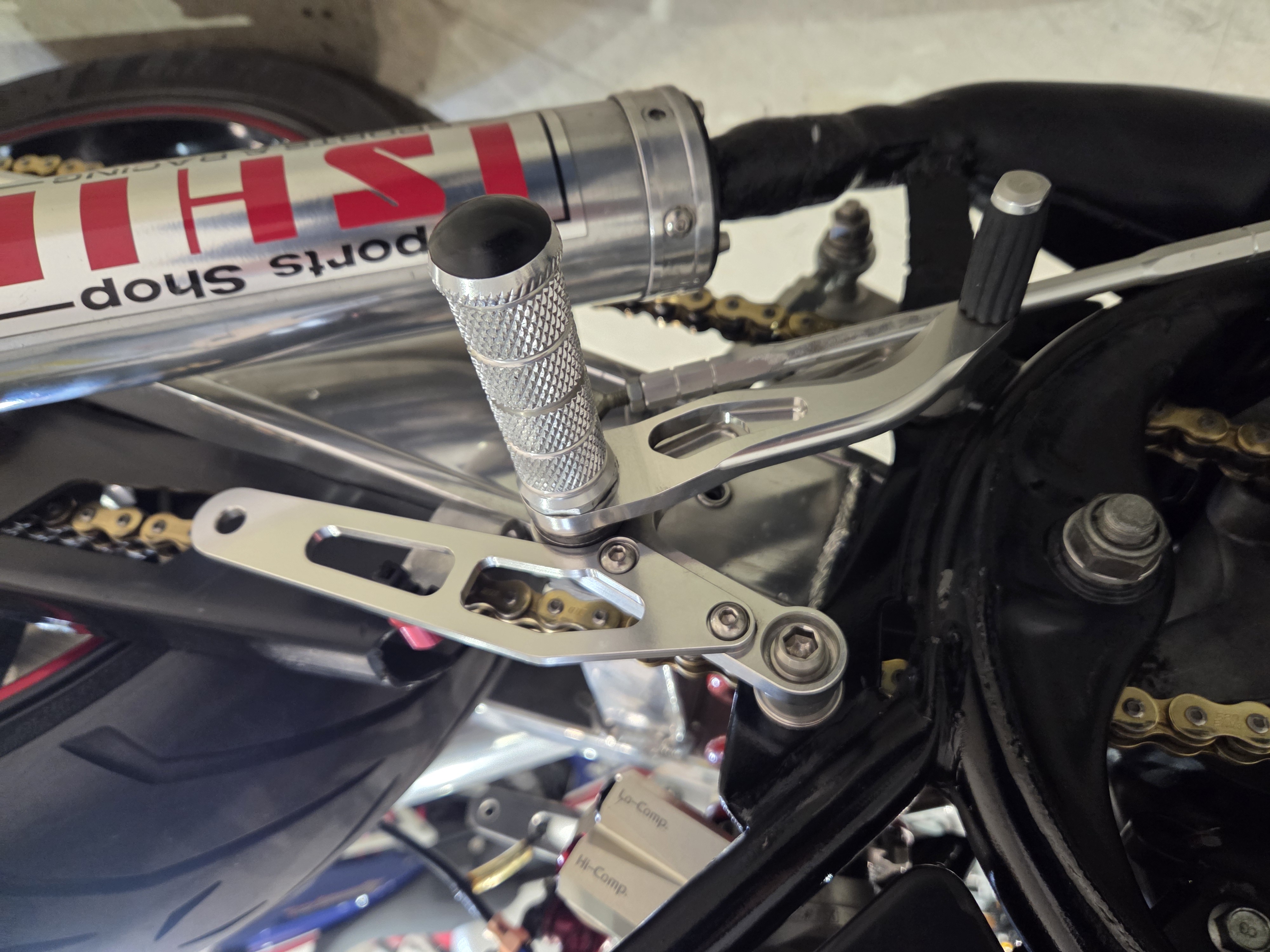 カスタムパーツ・SSイシイチャンバー、PWK28キャブ、エンジン350cc換装、オイルポンプ350用、YSSリアショック、フロント周りYZFR1流用、6ポッドキャリパー、ブレーキローター、スイングアームFZ6流用、キャリパー、ブレーキローター、前後ホイール、OSRCDI、リアフェンダーレス、ロックアップクラッチ、ケースカバー、アップハンドル、バックステップ、ストロボカラー・プロショップ全塗装、タンク上部キング・ケニー・ロバーツ氏の直筆サイン入り
