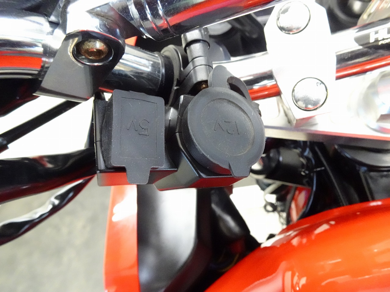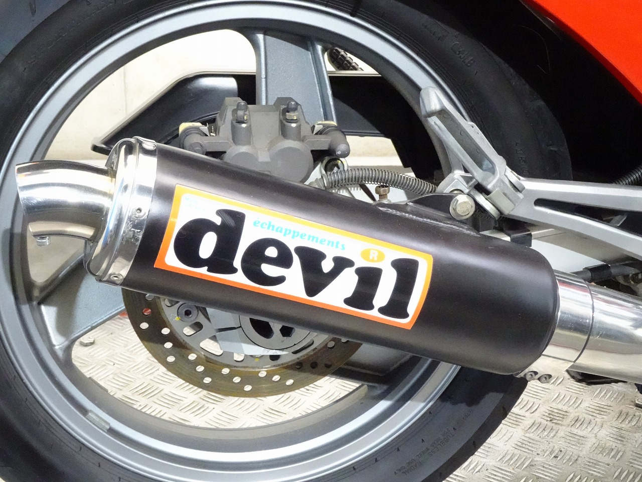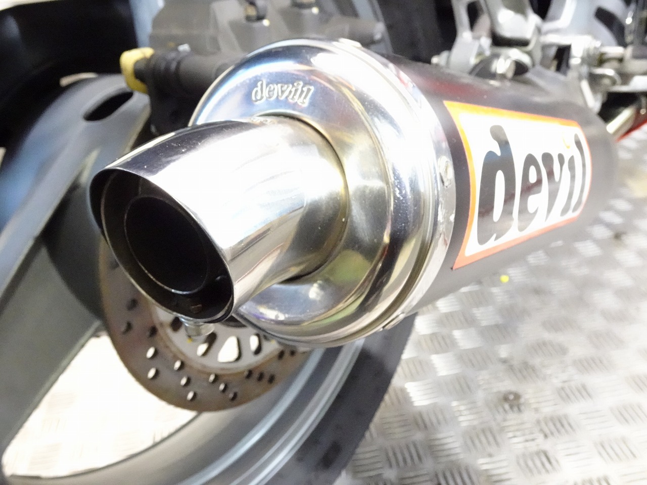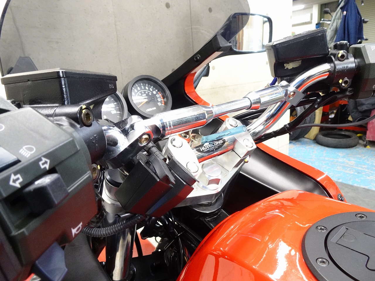 ETC車載器、DEVIL製マフラー、サイレンサー、スクリーン、ブレーキホース、ハリケーン製アップハンドル、ハンドルポスト、トップブリッジ、グリップ、シート、フェンダーレス、オイルフィラーキャップ、USB電源、ソケット