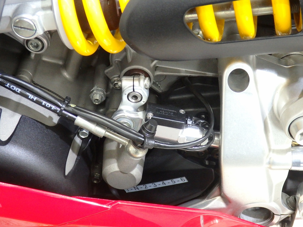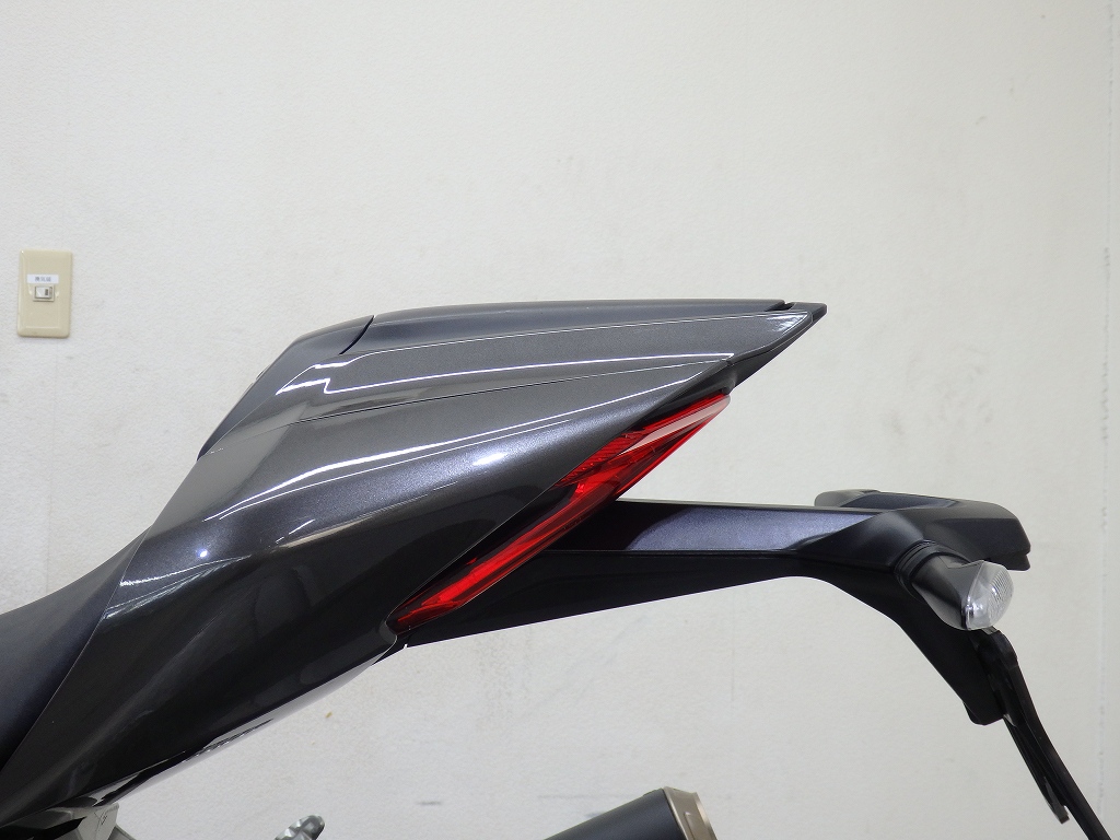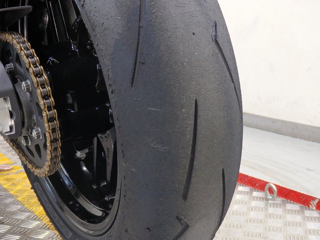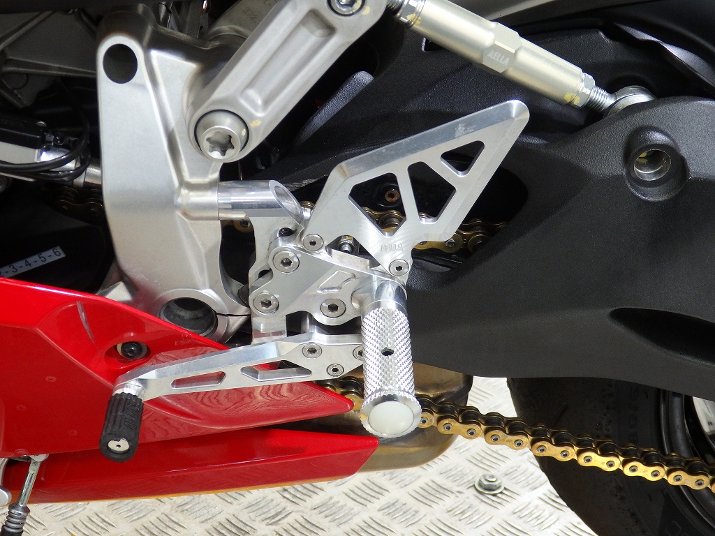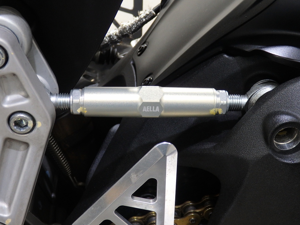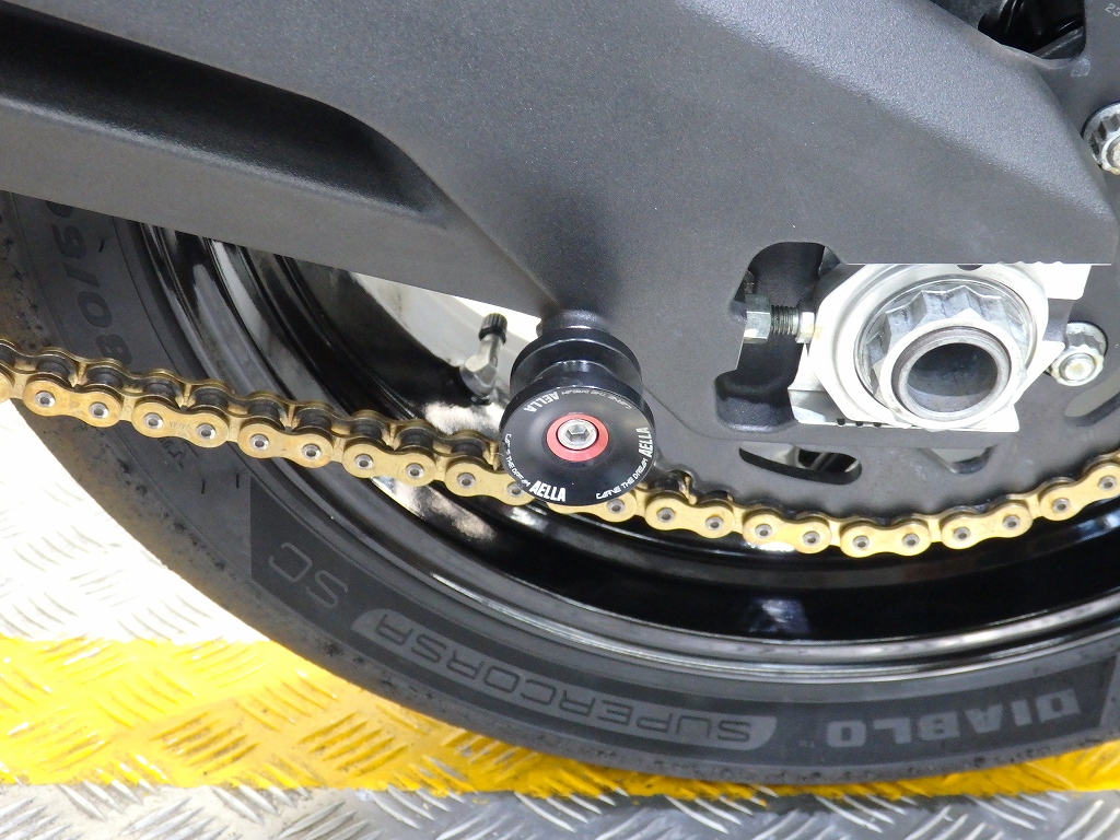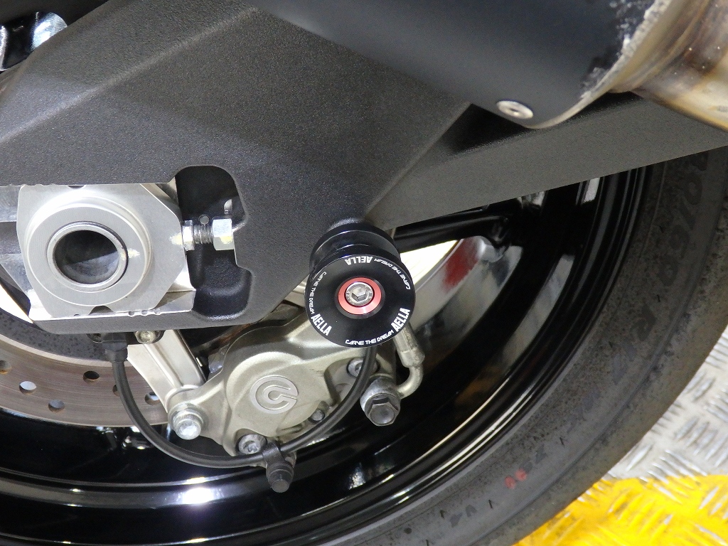 社外製シートカウル、フロントアクスルスライダー、アエラ製車高調整リンクロッド・レーシングスタンドフック・バックステップ、左右グリップ、可変ブレーキ・クラッチレバー、クラッチカバー、タンクパッド、ラジエターコアガード、