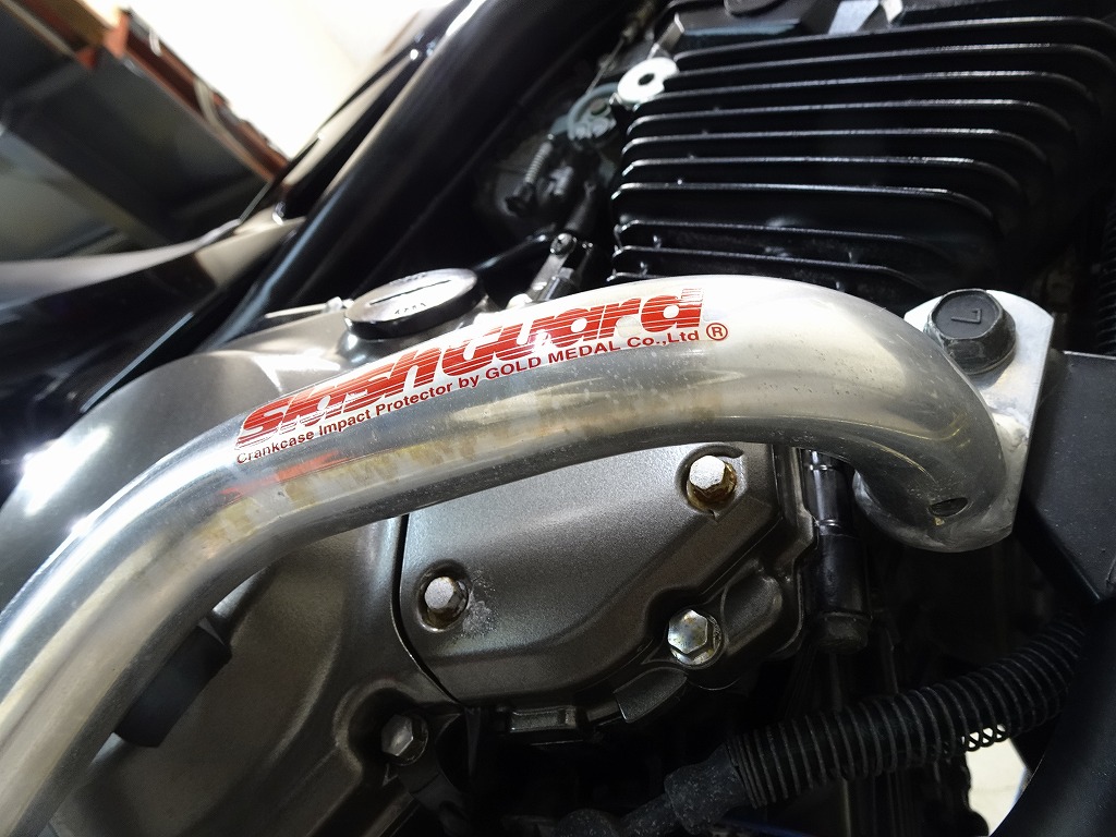 ゴールドメダル製エンジンガード、スモークウインカーレンズ、バーエンド