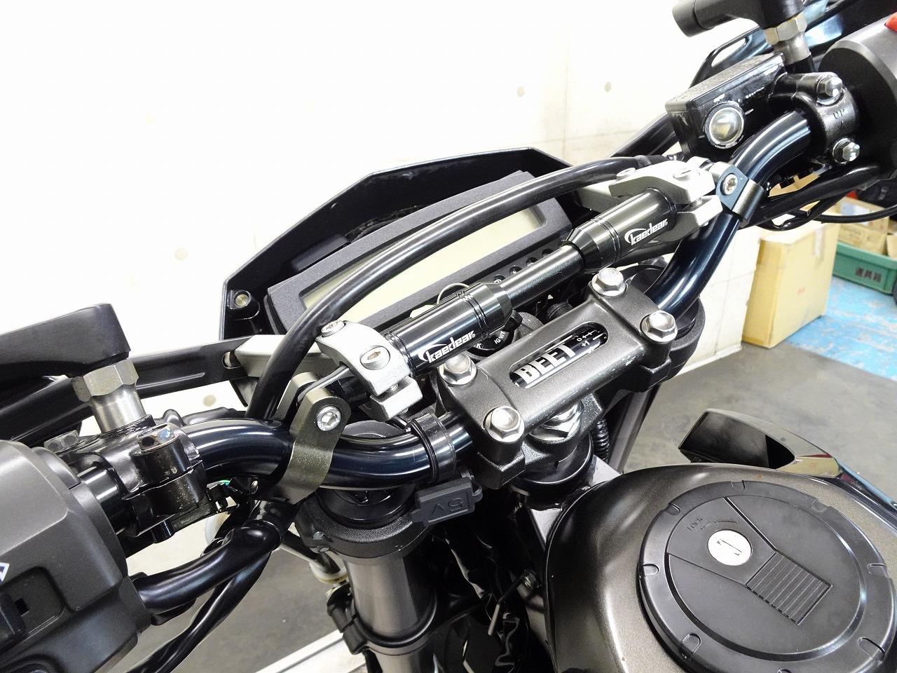 ETC車載器、BEET製ハンドル、Kaedearハンドルブレース、左右ミラー、ナックルガード、SPIRALシートカバー、ZETAチェーンガード、シフトペダルカバー、グリップヒーター、LEDヘッドライトバルブ、フェンダーレス
